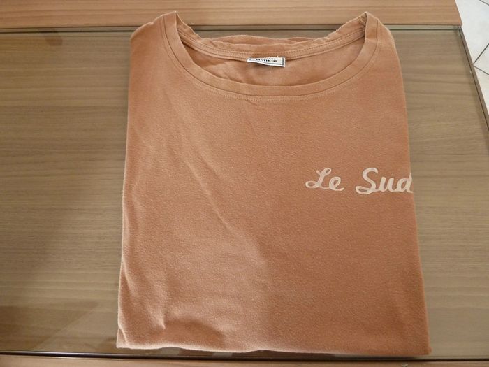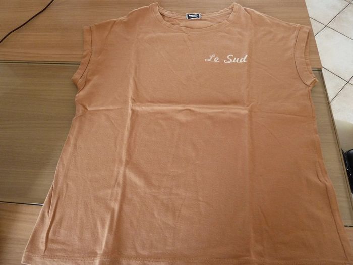 T shirt Pimkie marron clair avec manches courtes à revers. Sur le devant, il est indiqué Le Sud