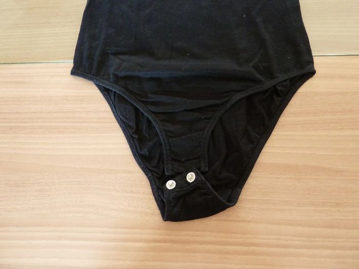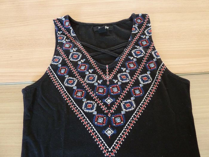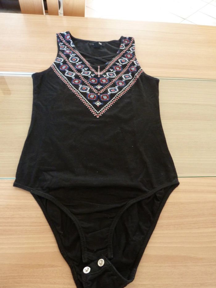 Body Jennyfer taille XS fermé en bas avec 2 pressions. Sur le devant broderie rouge, bleu et noir.
