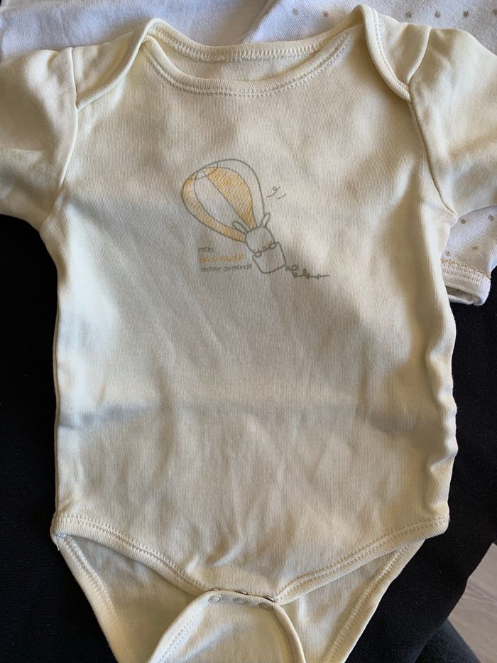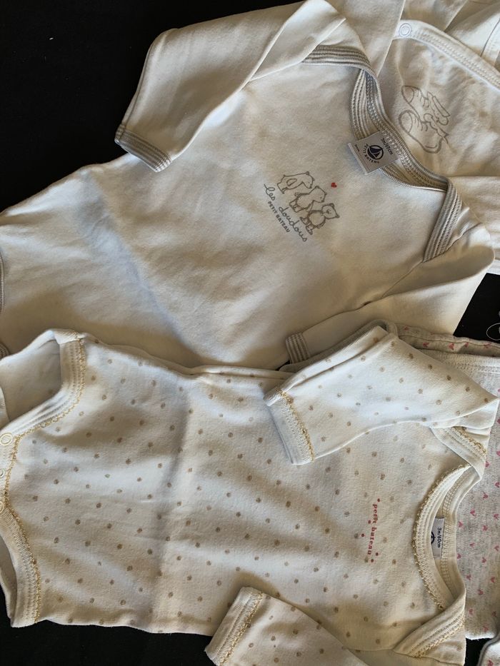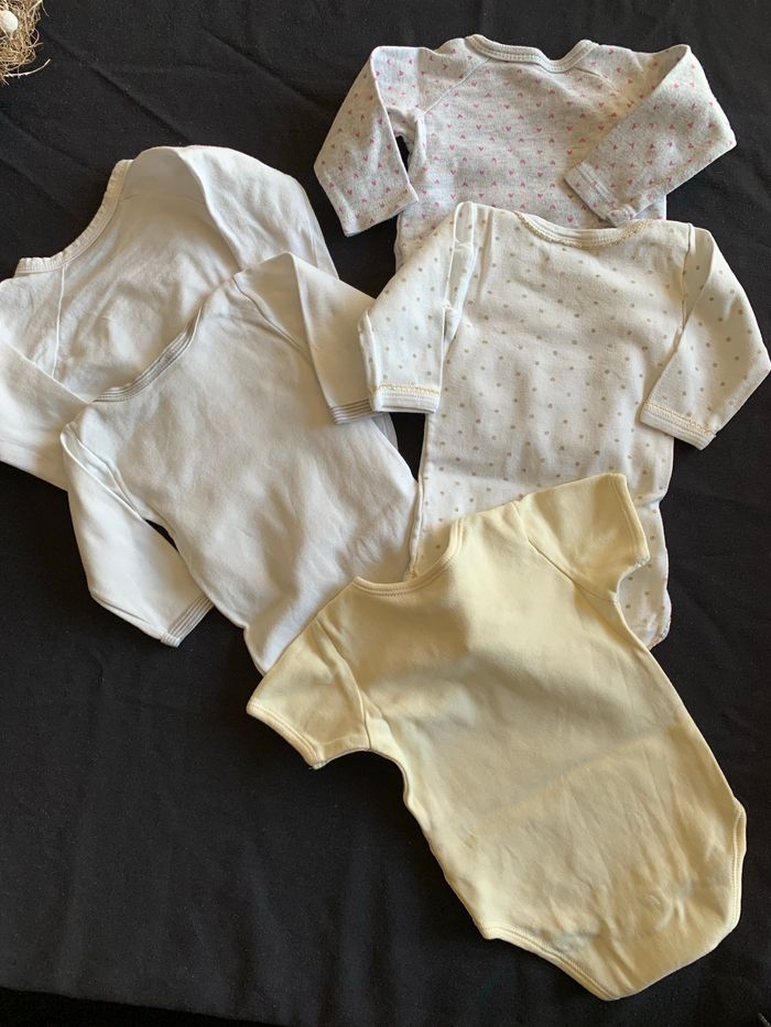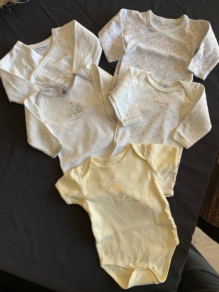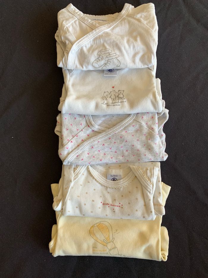 * 4 bodies manches longues et 1 body manches courtes * Très bon état, peu portés * Pas de trous, ni tâches, boutons pression ok * Diverses marques : Petit Bateau, Les chatounets, …