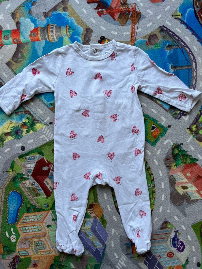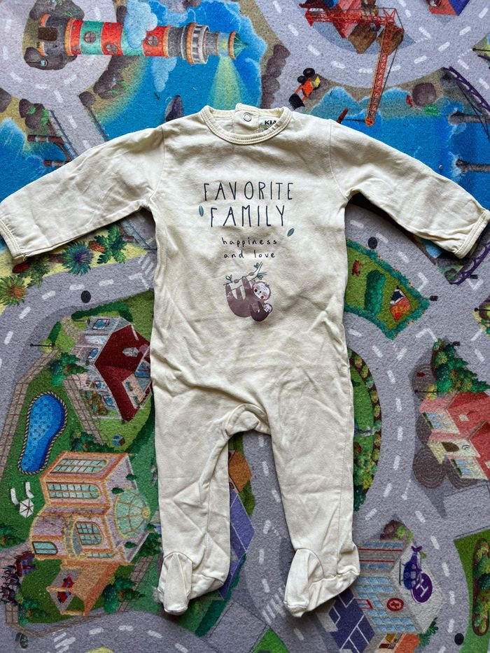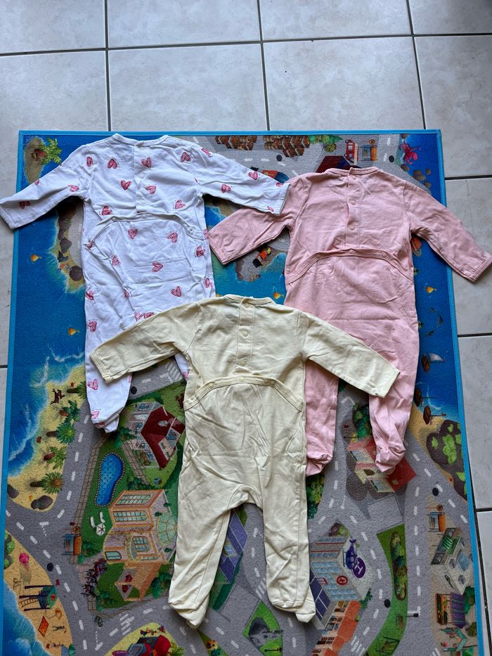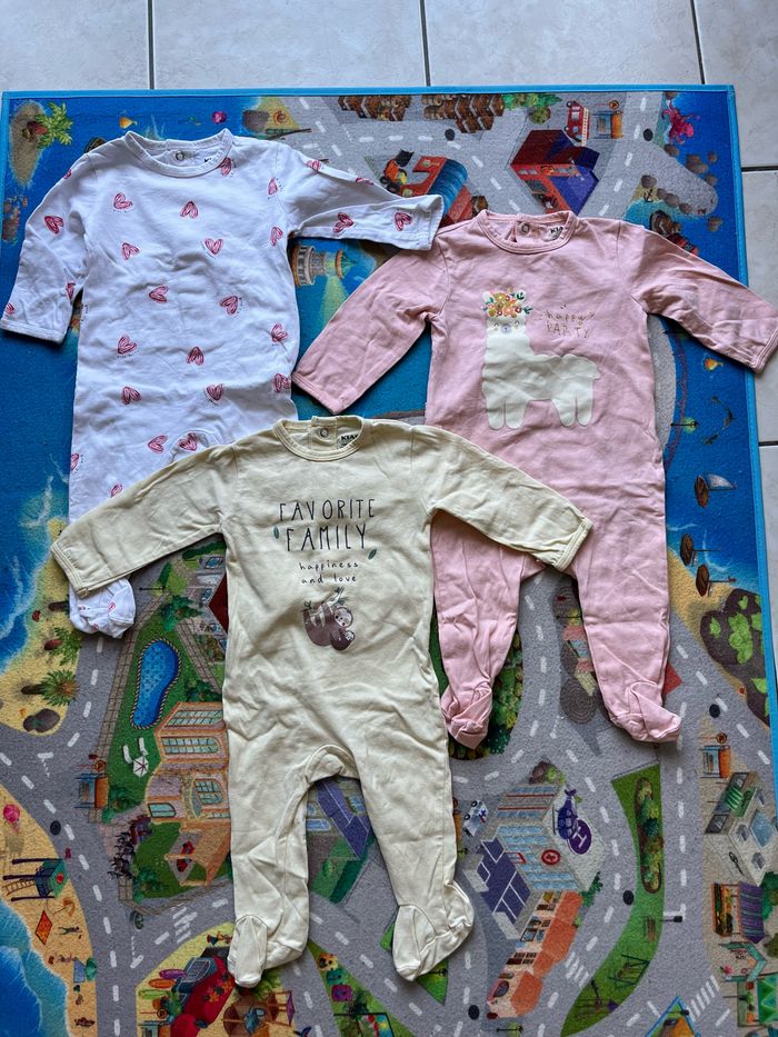 Lot de 3 pyjama fin pour printemps en taille 6 mois. Ils sont en très bon état, il y a juste des toutes petites taches jaunes (du au stockage) sur le blanc mais elles ne se voient quasiment pas (voir photo 6). Ils viennent de chez Kiabi