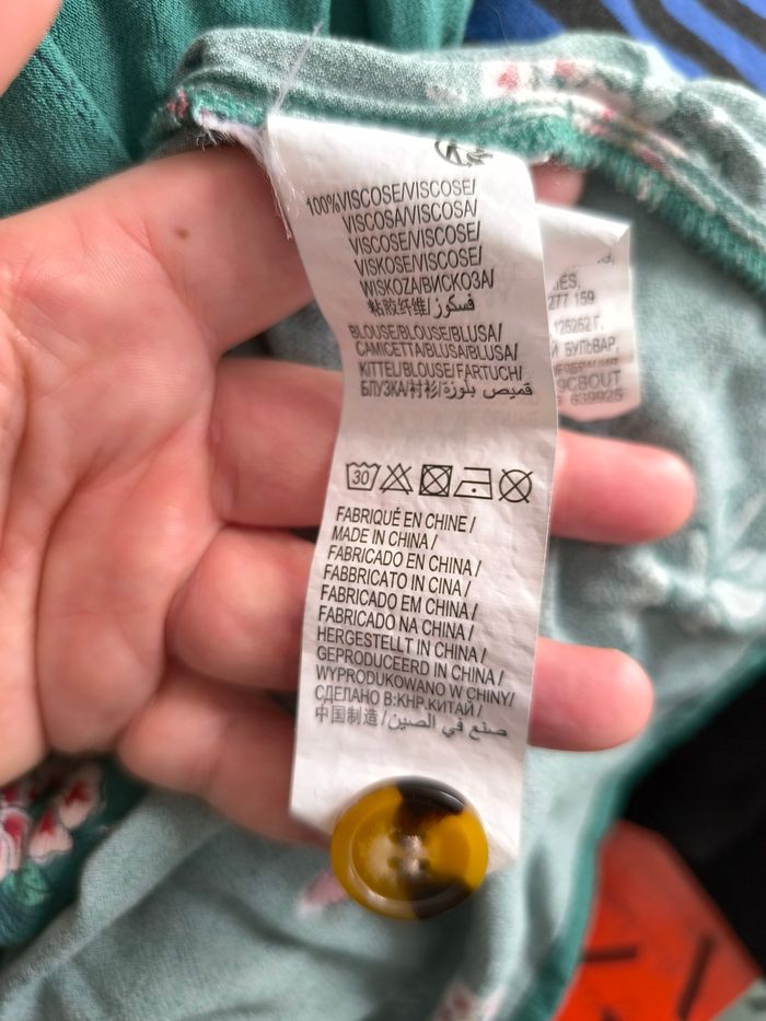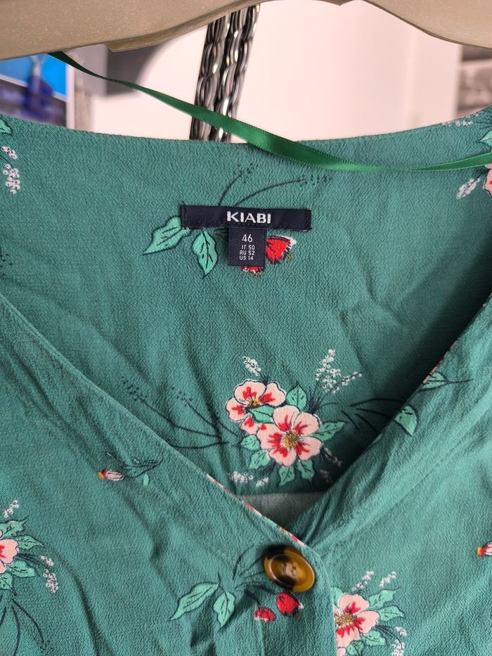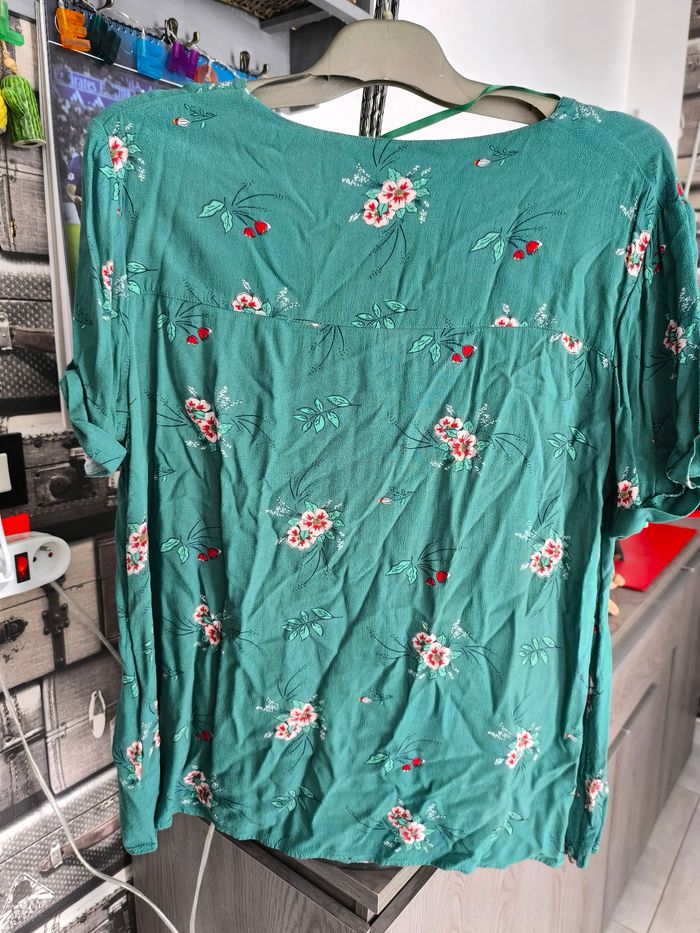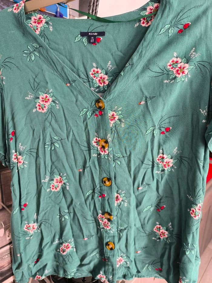 Marque: Kiabi Couleur:Elle ressort très mal fond vert imprimé floral multicolore Taille : 46 mensurations en photo Matière: Voir photo État:RAS peu porté Manches retroussés et les boutons s'ouvrent complètement Vendu en l'état (à repasser)