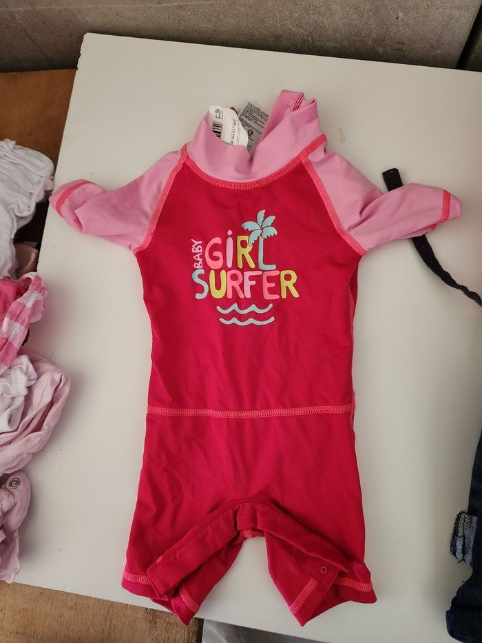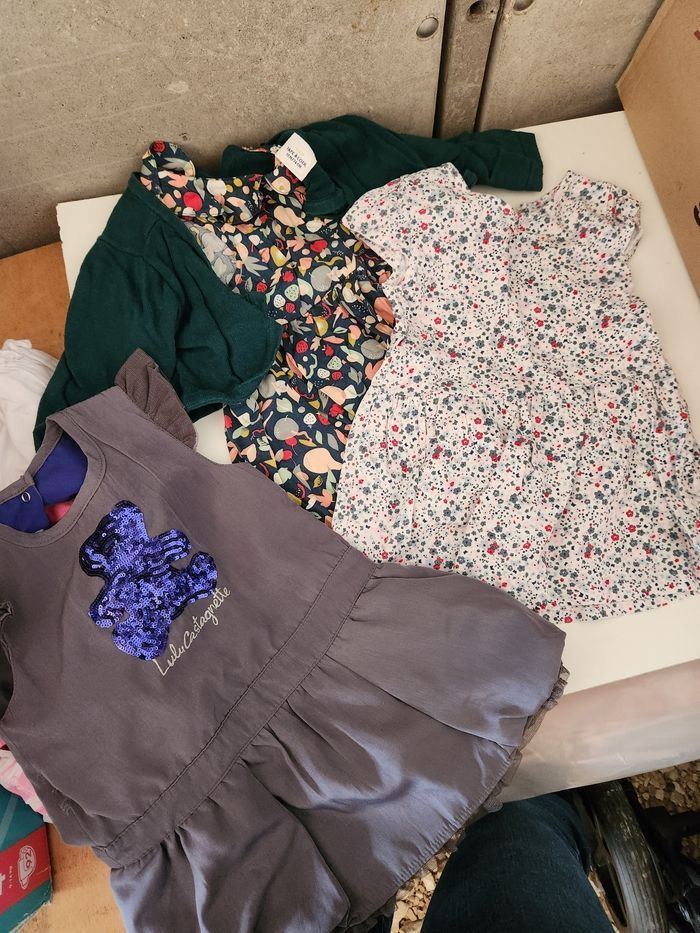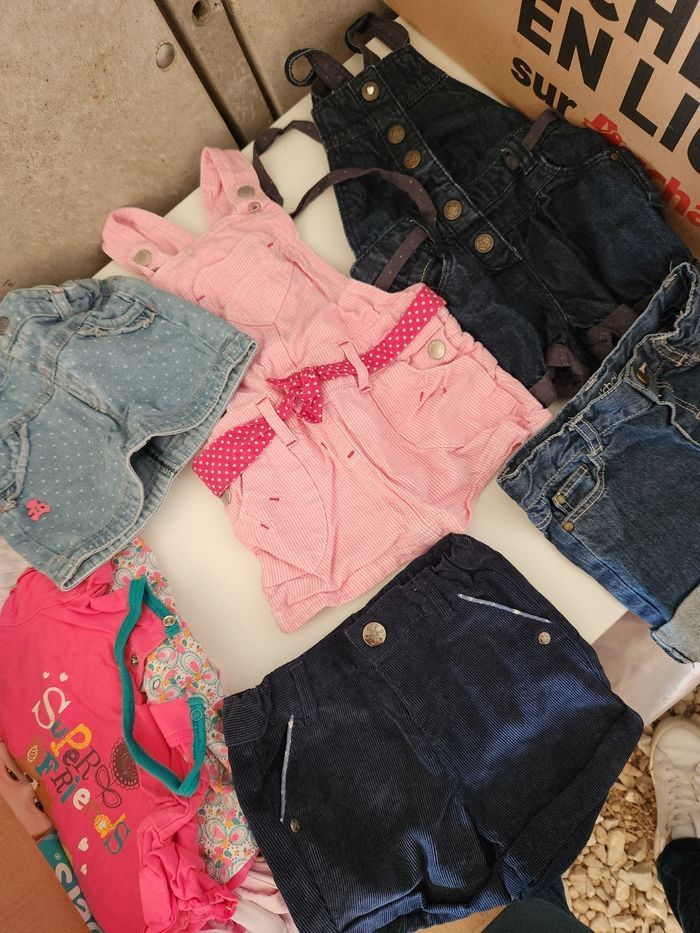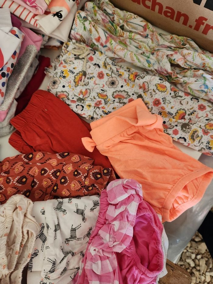 Lot de 95 articles : - 5 bodys MC - 6 bodys bretelles - 2 bodys ML neufs - 8 pyjamas fin /demi saison - 1 pyjama epais - 3 maillots de bain - 3 chapeaux dont 1 casquette longue anti UV - 8 tshirts MC - 7 tshirts ML - 2 pantalons - 8 shorts - 3 jupes - 2 shorts - 2 combi shorts - 1 combijupe - 1 combi UV - 13 robes dont 1 avec sa veste - 1 combinaison - 4 bloomers - 3 leggings - 3 blouses légères - 4 gilets dont 1 sans manche - 3 vestes ( 2 capuches dont 1 réversible) - 5 collants - 1 veste mi saison Multimarques : Kiabi, Orchestra, Gemo, Mayoral, Serge tu Major, DPAM... Il se peut que qq vêtements soient moins beaux et passés que d'autres mais l'ensemble est en bon état.