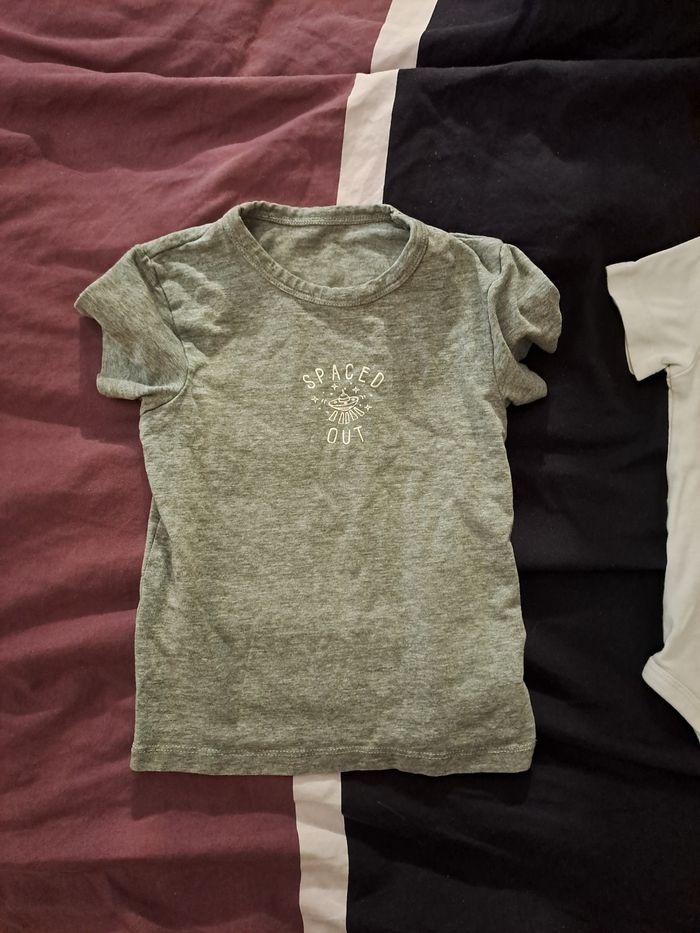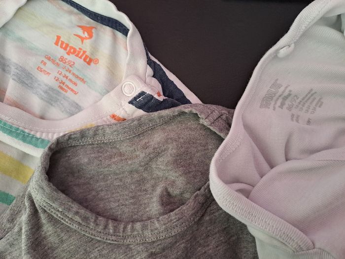 Lot de 2 tee-shirts manches courtes et 1 bodie manches courtes. En 12-24 mois. Ils ont des tâches et/ou des bouloches. Non repassé.