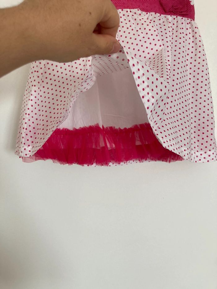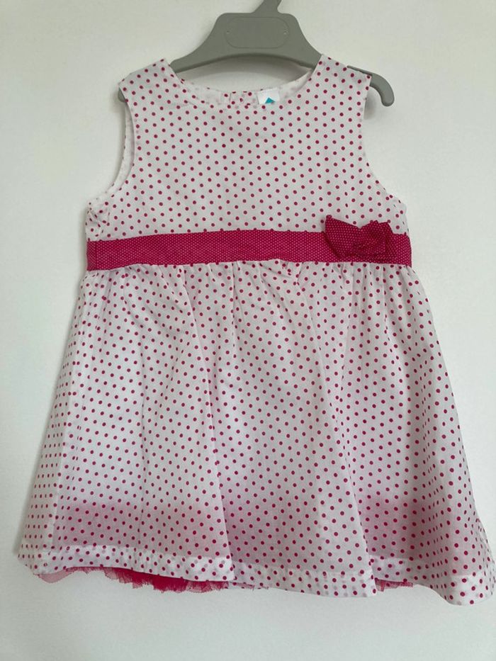 Robe d’été sans manches, doublée avec du tulle rose en bas. 3 boutons dans le dos et petit noeud a la taille. En parfait état