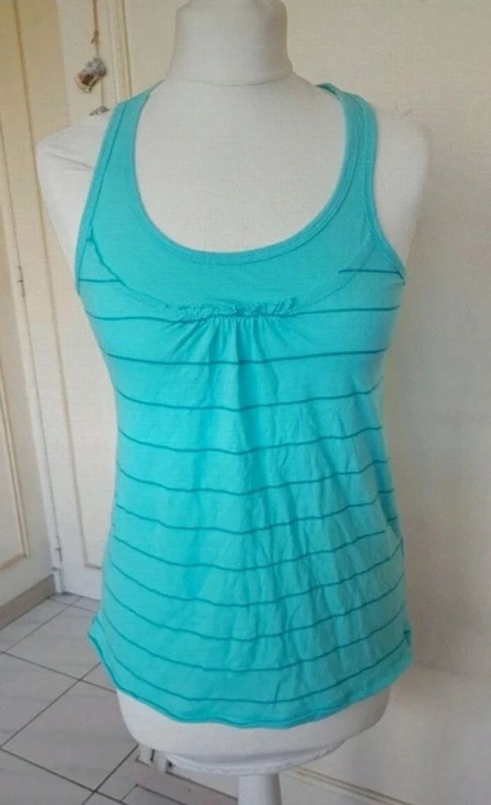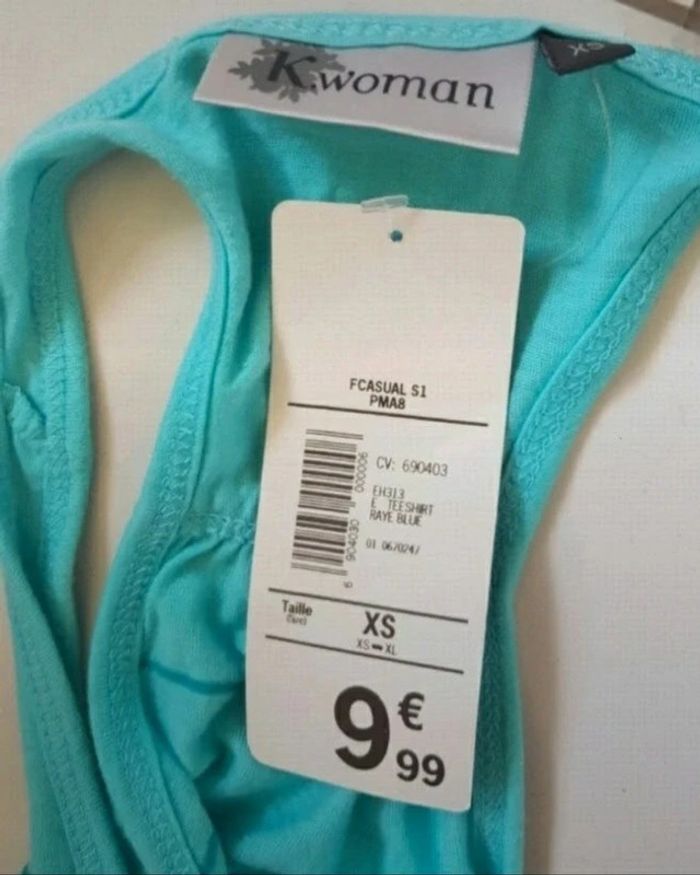 🌸💜😊😊Merci de me contacter avant tout achat car je suis souvent en déplacement afin d'être sur que je puisse envoyer le colis dans les temps. MERCI😊😊💜🌸 Débardeur bleu ciel turquoise rayé. Matière légère pour l'été. Neuf avec etiquette, acheté 10€ Il est ecrit XS sur l'étiquette mais c'est un 38. Marque Kiabi