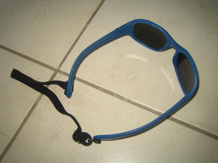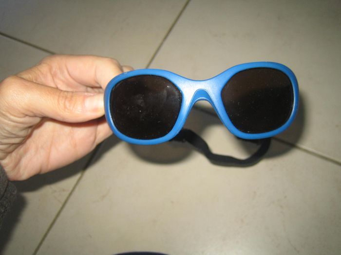 lunettes de soleil bébé de 3 à 1 an couleur bleu avec élastique derrière tête pour que les lunettes tiennent bien