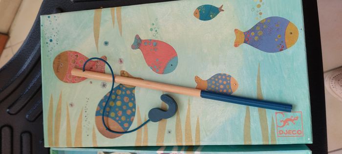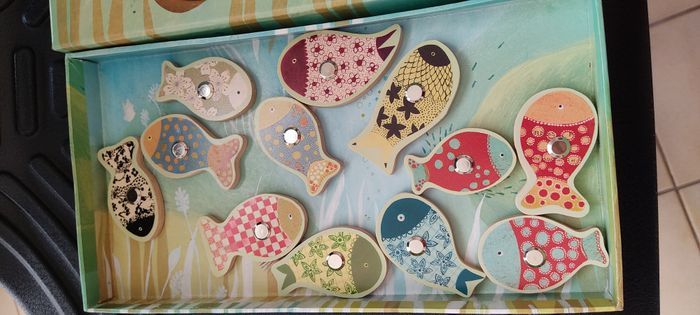 Jeu de pêche à la ligne de marque Djeco pour 2 enfants. 12 poissons en bois décoré avec points magnétiques + 2 cannes à pêche en bois avec hameçon en bois avec point magnétique ( une bleue, une rouge) Jeu complet et en parfait état, boite renforcée (à peine visible) Disponible à Massy 91, envoi possible