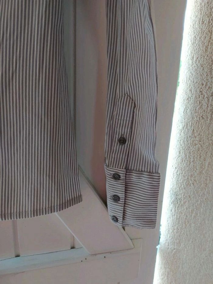 Très jolie chemise Couleur grise et blanche rayée Joli décolleté et finition au niveau des manches Coupe ajustée Remise sur lots activées🎁 #celine_yiyi_hauts #celine_yiyi_hauts34 #celine_yiyi_chemise