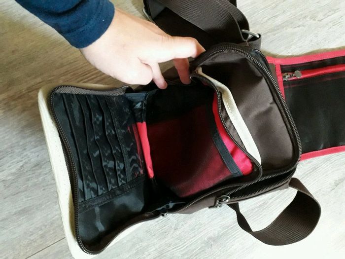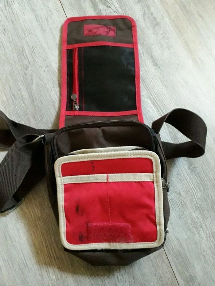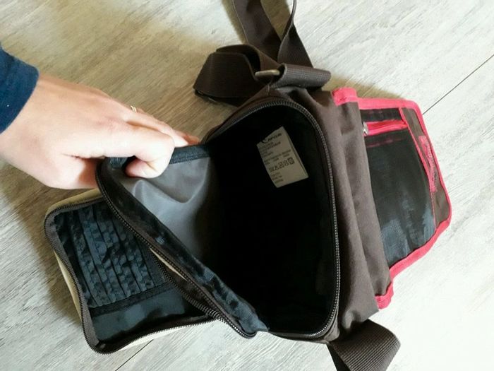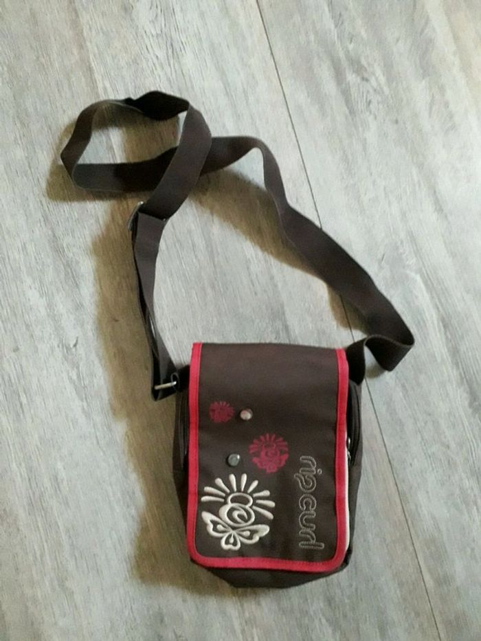 Vends sac / pochette de marque Rip Curl Plusieurs pochettes à l'intérieur Il y a une tâche noire à l'intérieur de la petite poche (voir photo 4), à nettoyer... Fermeture éclair et scratch ok.