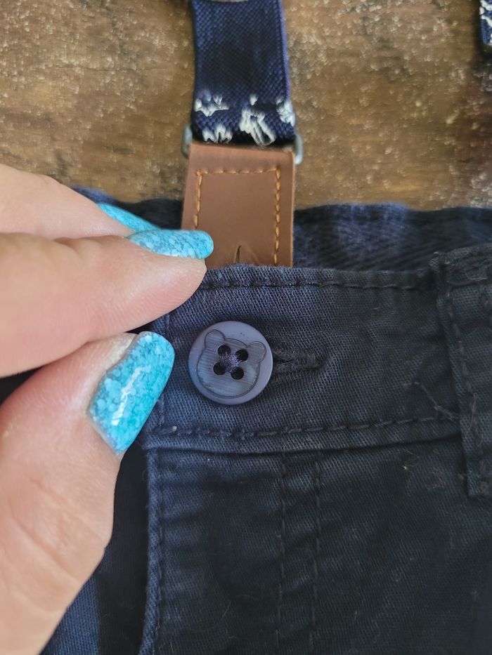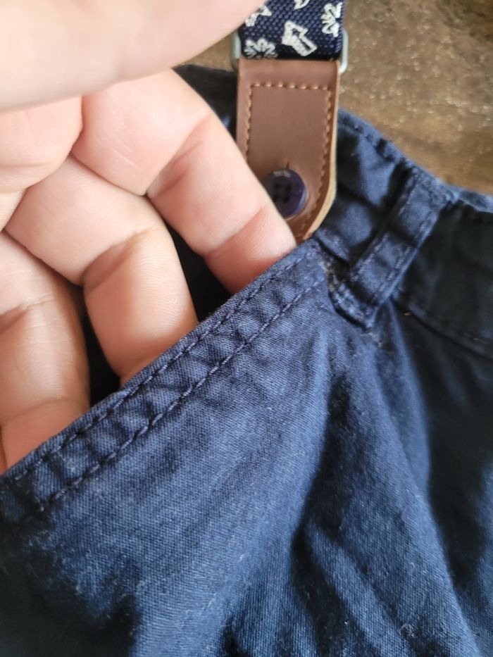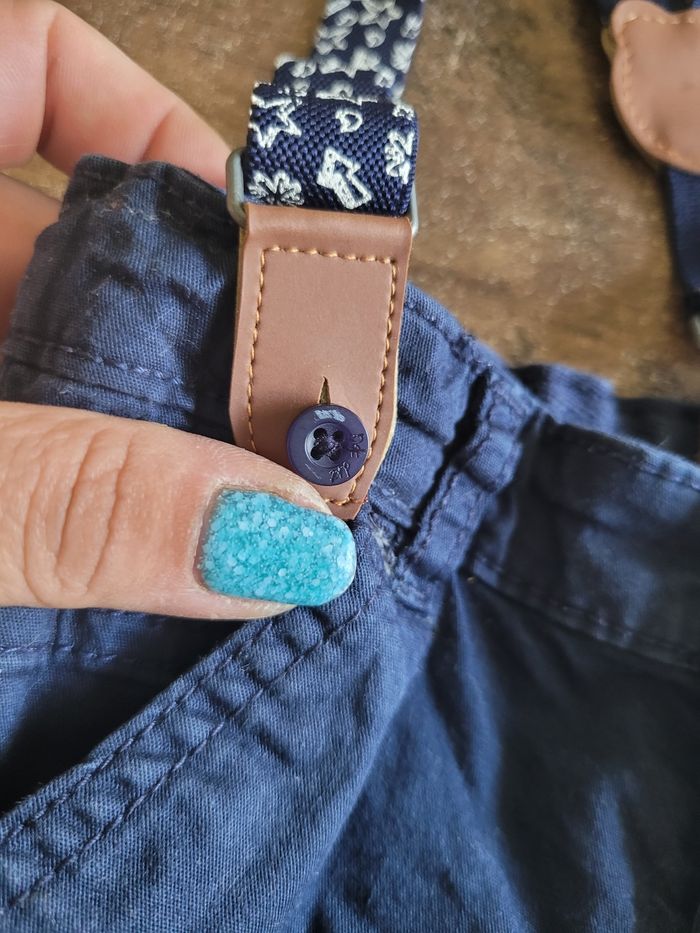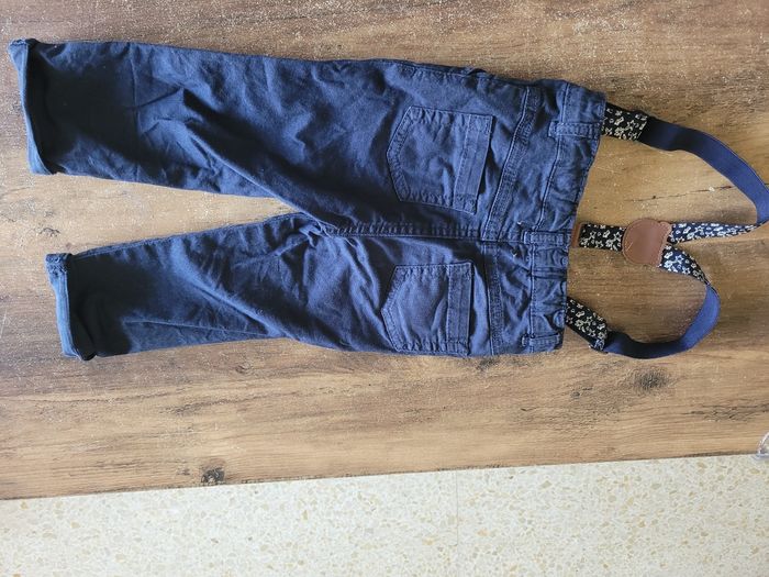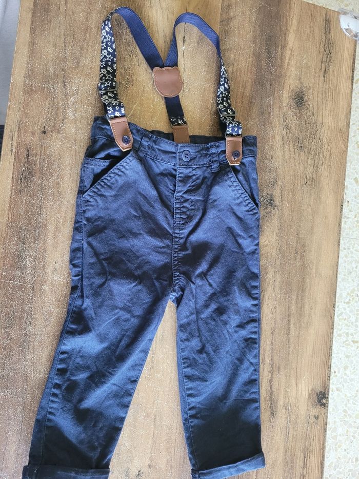 Petit pantalon à Bretelles Bretelles qui enlevé Taille 18 mois Mi saison Couleur bleu marine Réglable sur les côtés Vrai poche devant et derrière Matière 97% coton 3% elastanne