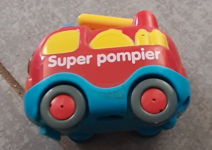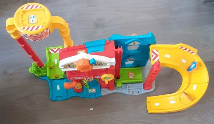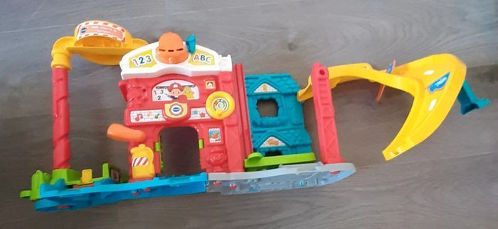 Caserne de pompier tut tut bolide manque quelques morceaux de route pour attacher la descente jaune à la caserne mais n'empêche pas du tout de jouer avec camion Barnabé super pompier quelques traces d'usures sans gravité fonctionne parfaitement vendu sans piles