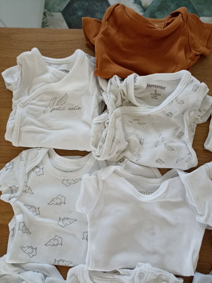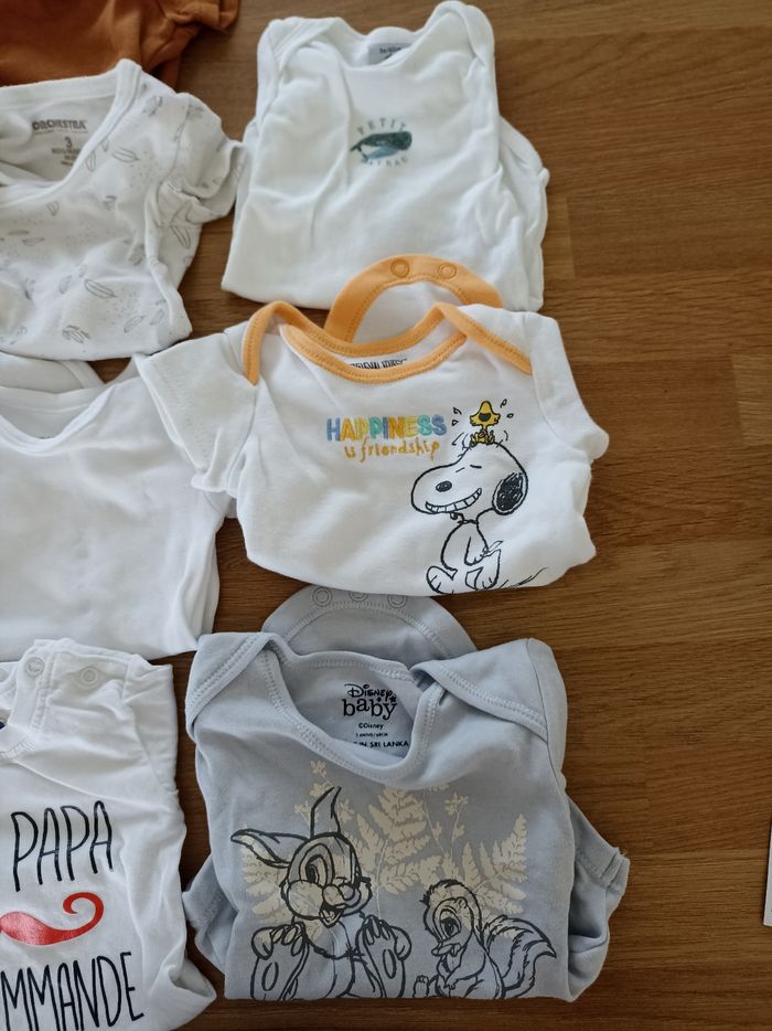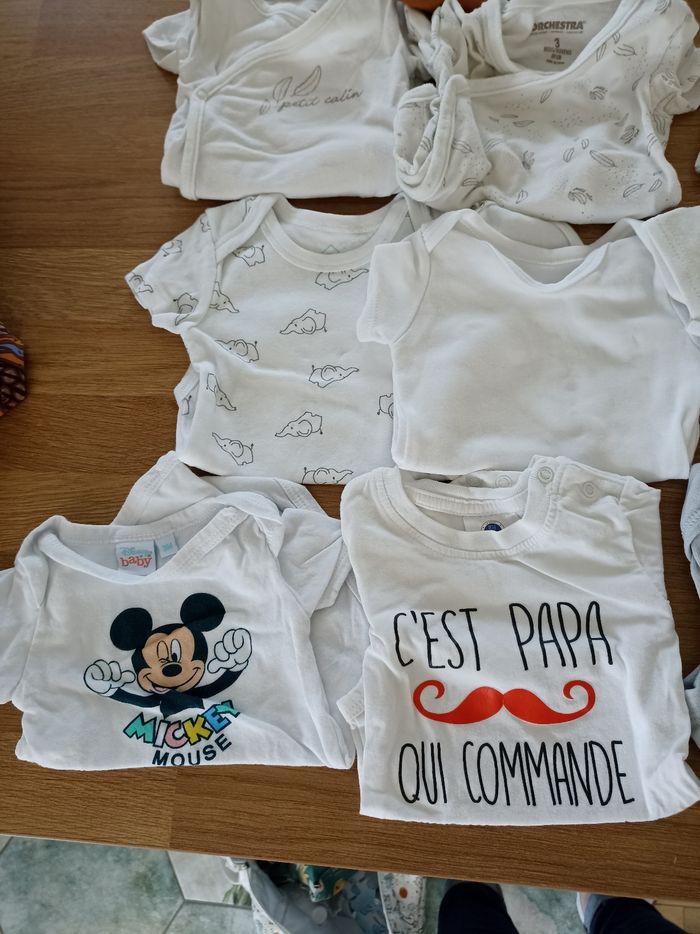 Lot 10 body taille 3 mois 👌Très bon état 2 orchestra 1 petit bateau 2 in extenso 1 tex 2 Disney 1 Primark 1 "c'est papa qui commande" taille 3/6 mois