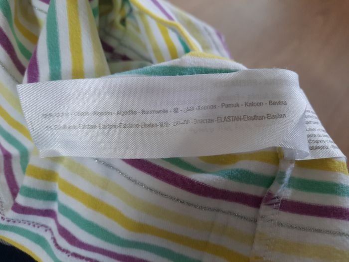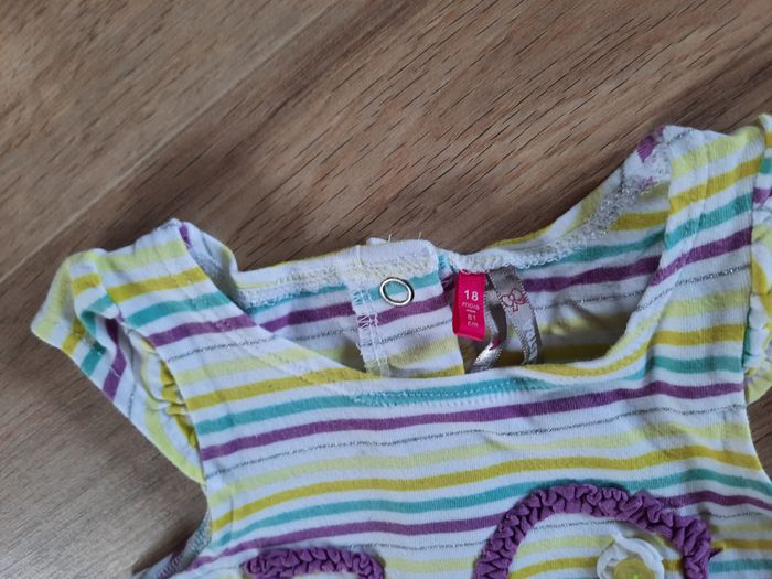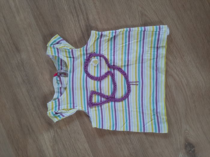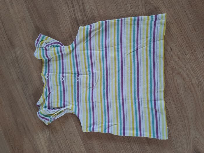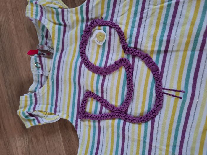 T shirt sans manches motif Oiseau blanc à rayures violet/jaune/bleu/argenté boutons pressions au dos 95% coton 5% élasthanne très bon état #annabelle_60_filledixhuitmois