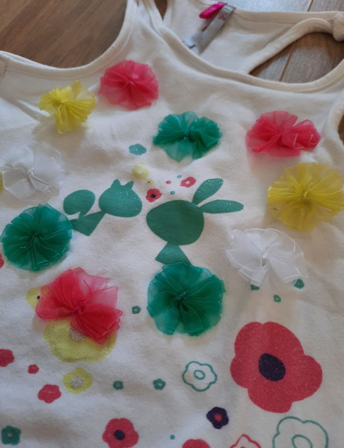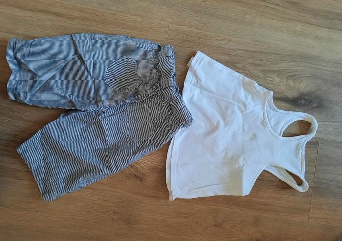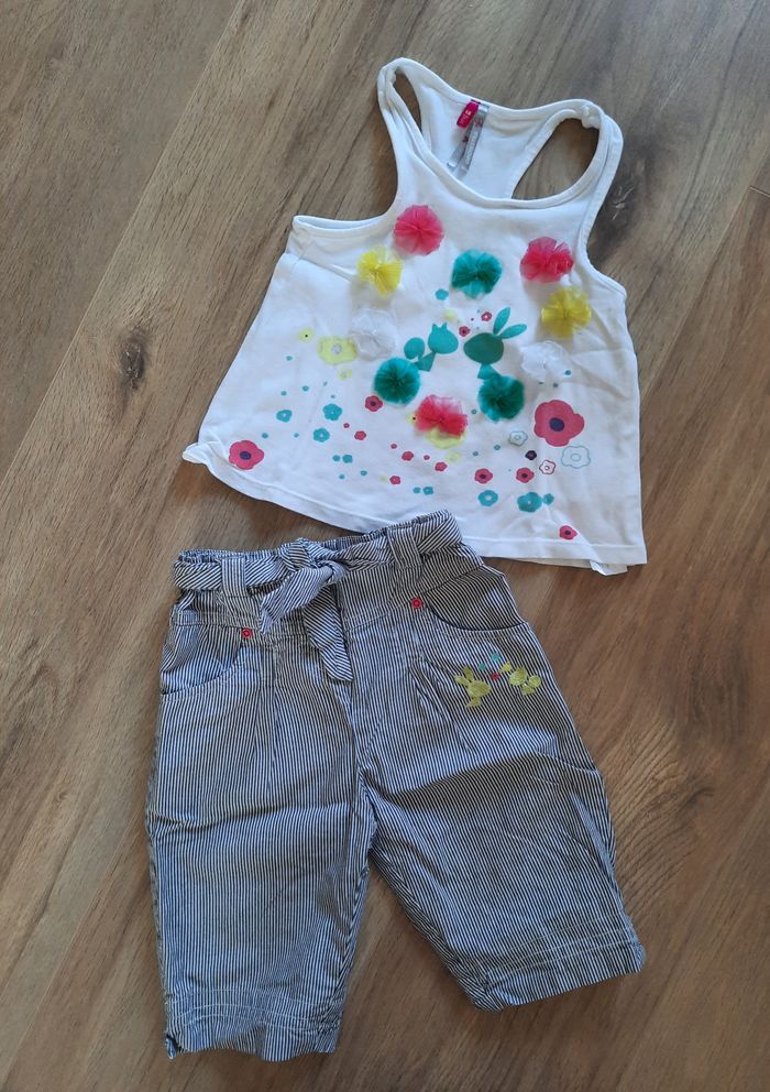 Pantacourt en coton à rayures blanc/gris débardeur assorti blanc imprimé avec tissu multicolore en relief très bon état #annabelle_60_filledixhuitmois