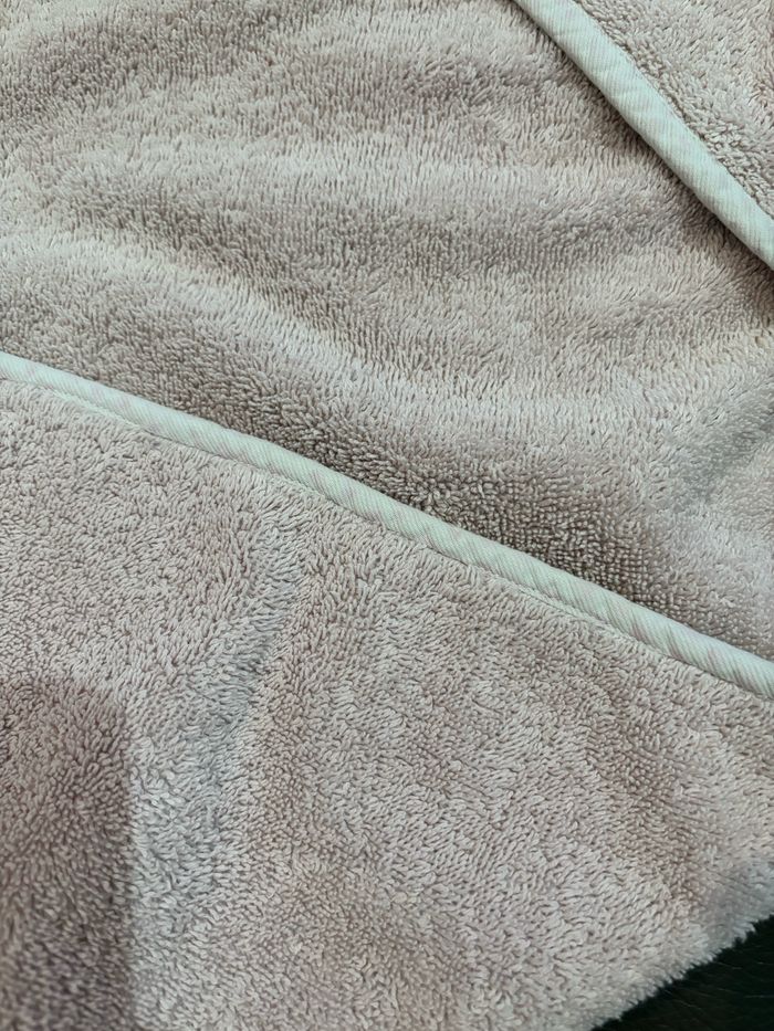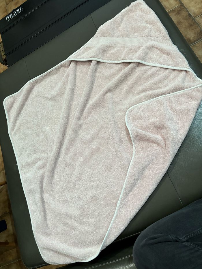 Environ 1m de côté, génial pour bien entourer bébé à la sortie du bain (ou de la piscine, mer….)