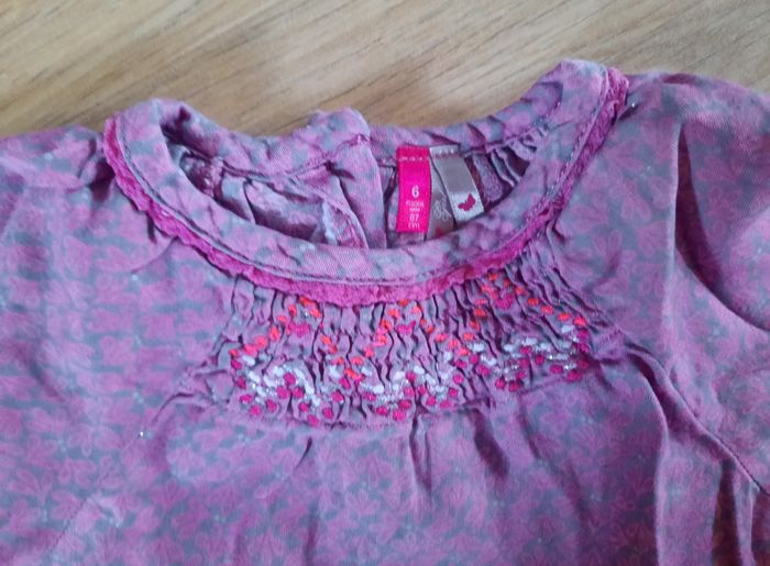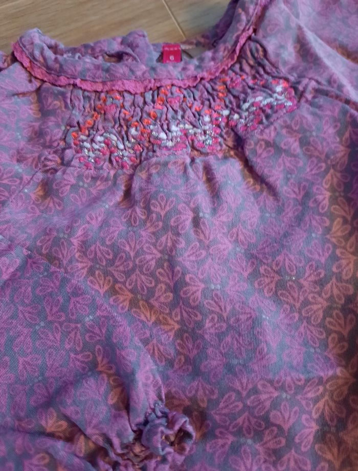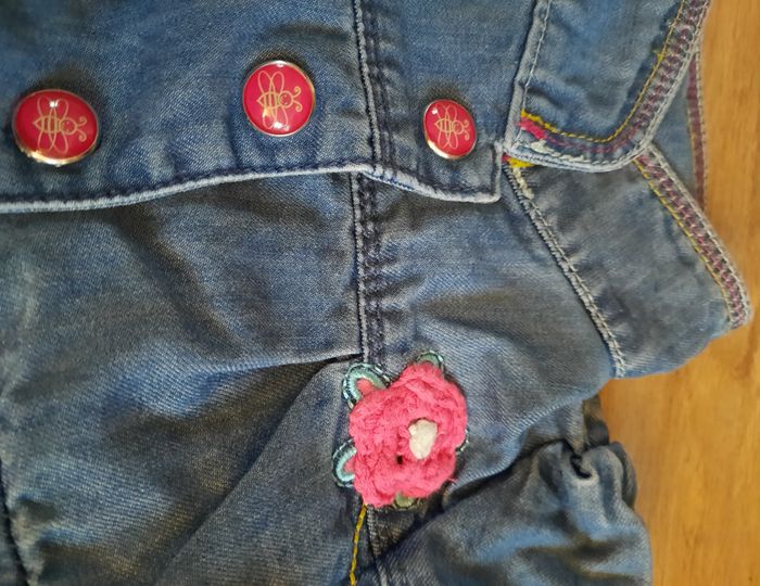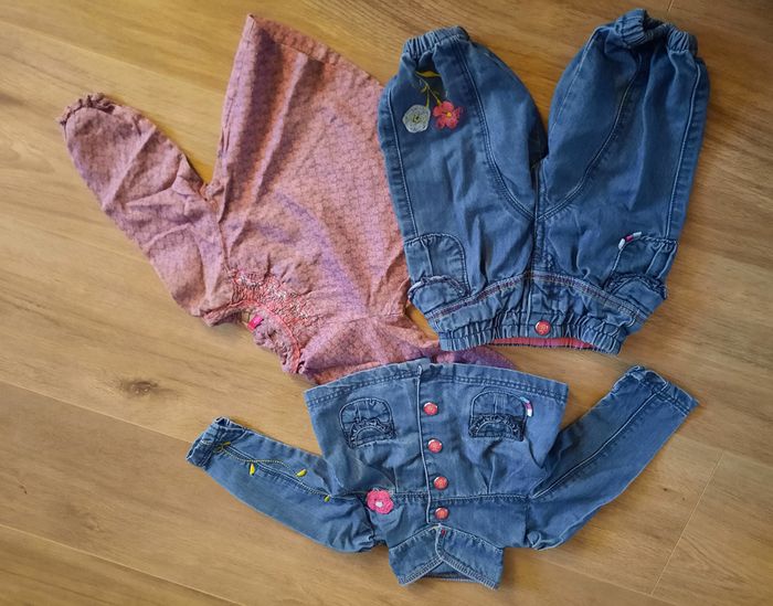 Blouse rose et grise fleurie à manches longues boutons au dos et veste en jean à fermeture boutonnée à pressions et pantalon en jean assorti avec effet volanté au dos très bon état #annabelle_60_fillesixmois