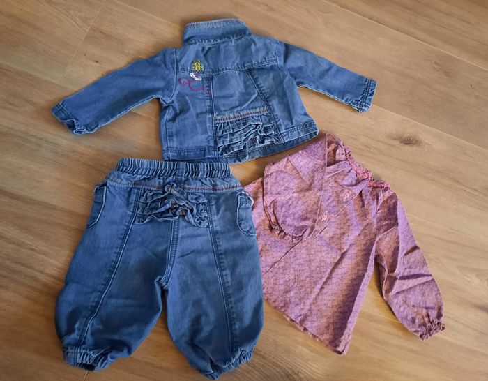 Ensemble veste en jean+ pantalon en jean + blouse assortie motifs rose/gris Orchestra 6 mois - photo numéro 1
