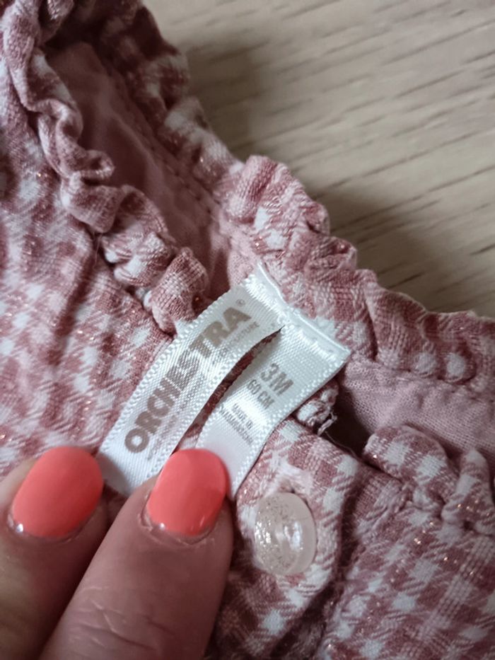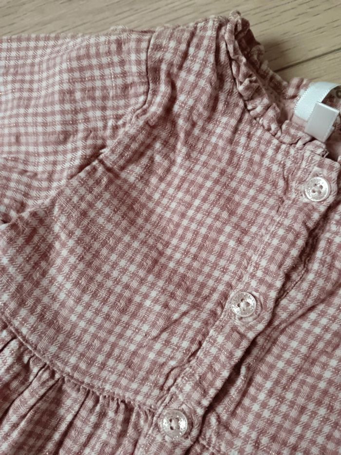 Robe avec petits carreaux rose et blanc et un peu de fil doré, boutons également légèrement doré. En très bon état. Taille 3 mois 60cm. Doublé.