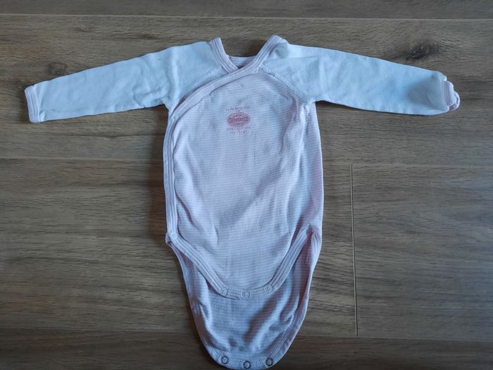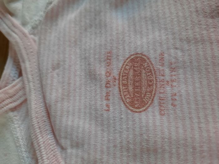 fines rayures rose/blanc fermeture croisée à boutons pressions sur le devant coton "bon état" car un petit accroc au col (visible sur photo 6). #annabelle_60_fillesixmois