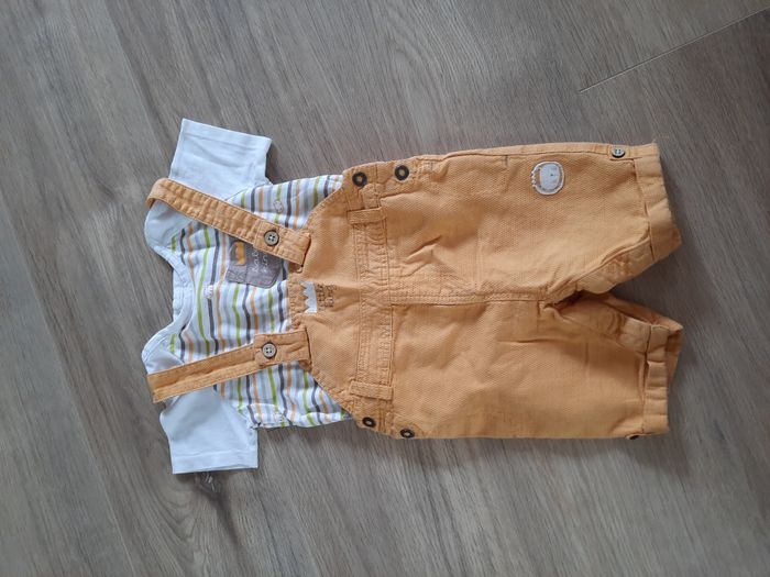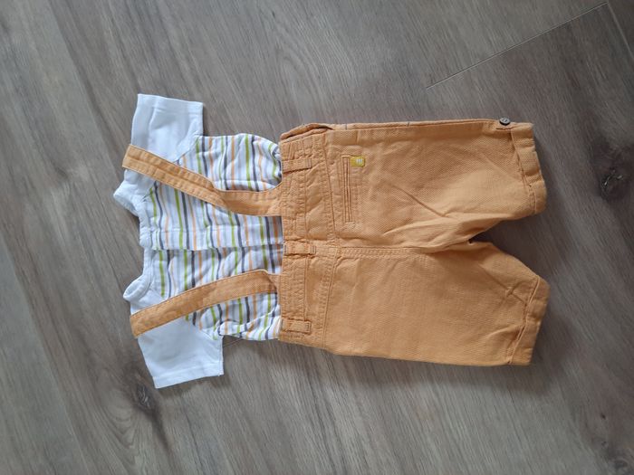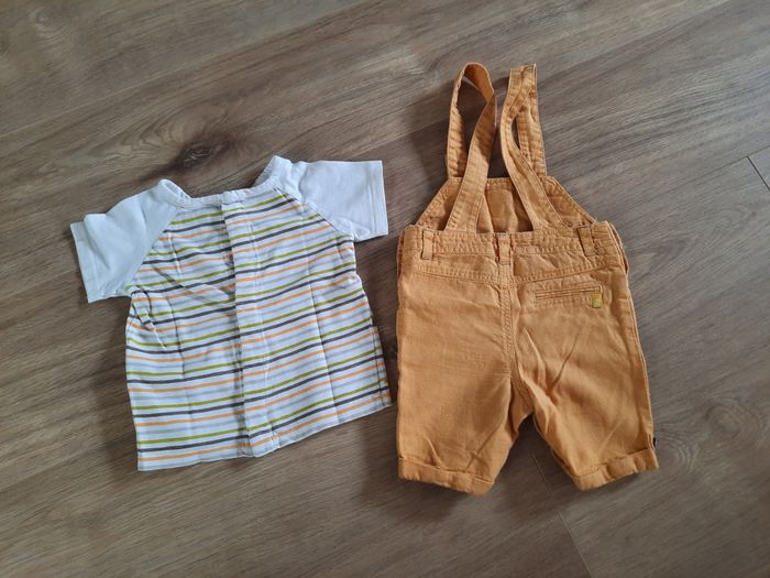 T-shirt à fermeture pressionnée au dos, blanc à rayures et Salopette-short à fermeture pressionnée à l'entre jambes Très bon état #annabelle_60_garçonneufmois