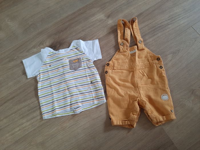 Ensemble été salopette/short jaune moutarde et T-shirt blanc à rayures Orchestra 9 mois - photo numéro 1
