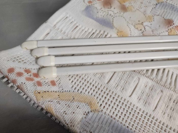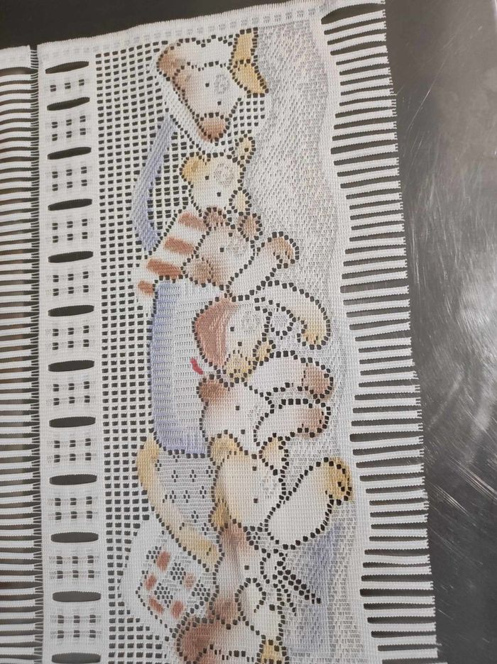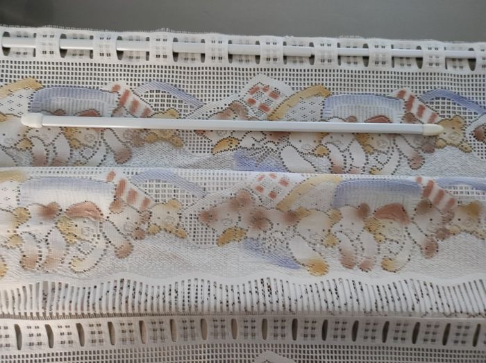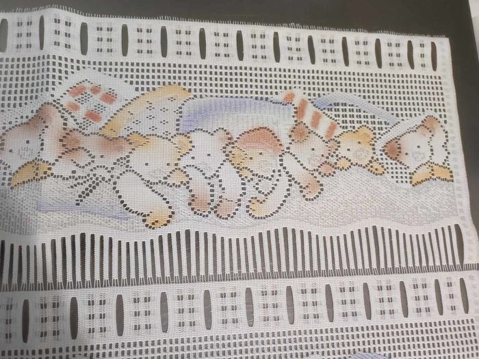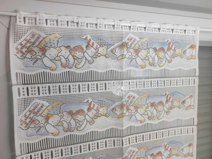 2 rideaux : 60 cm de large x 90 cm de haut Adaptable à fenêtre double battant Couleur : fond blanc avec motifs colorés Les motifs de nounours en dentelle apportent une touche apaisante. Tamisant, ils laisseront passer la lumière. Finition passe tringle sur le haut Finition en franges sur le bas Fournis avec 2 tringles de 40 cm de large extensibles jusqu’à 65 cm Les tringles sont à poser sur des crochets autocollants (non fournis) Motifs : « bonne nuit les oursons » Rideaux en très bon état Composition : 100% polyester Coloris : peint, blanc Lavage : 30°C cycle délicat Tringles légèrement jaunies sur les pointes extérieures Valeur 12 € la paire de rideaux, valeur 2 € la paire de tringles En disponibilité sur demande : 4 rideaux et 4 tringles pour 20 € Poids pour 2 rideaux + 2 tringles : 325 gr Poids pour 4 rideaux + 4 tringles : 650 gr