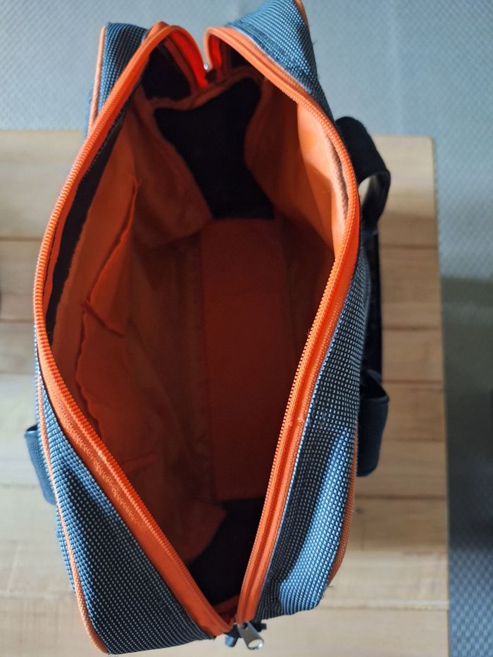 Sac avec 2 poignées et bandoulière réglable, 1 grande poche avec fond renforcé + 2 petits rangements intérieur + fermetureéclaire, 1 petite poche devant avec fermeture éclaire, gris et orange, tissu assez épais résistant, peu servi en bon état