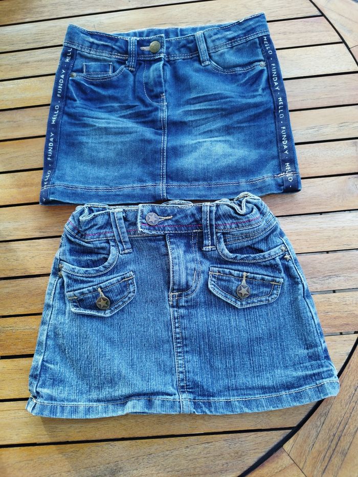 2 jupes en jean, taille 3 ans, en très bon état. Marques Tape à l'oeil et Tout simplement.