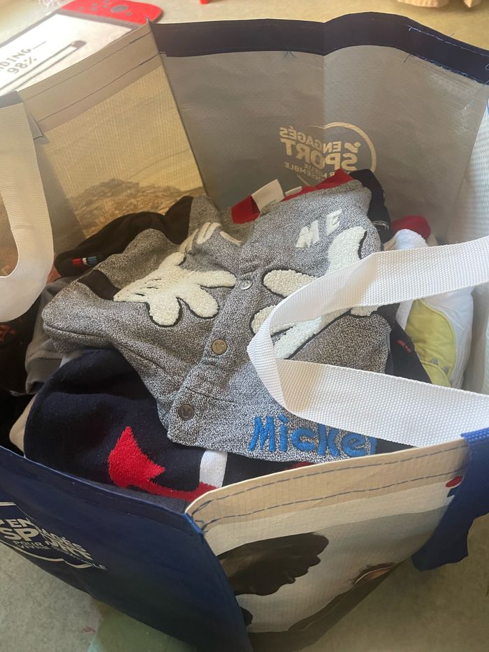 Tout et presque Disney a part les body pull et t gigoteuse né sans pas Disney le reste et tout mickey Winnie taille 0 mois à 3 mois y’a un peut de tout. Je dit bien que c’est pour bébé garçon 😁 J’ai fait un sac ou y’a un peut de tout Toute et Disney