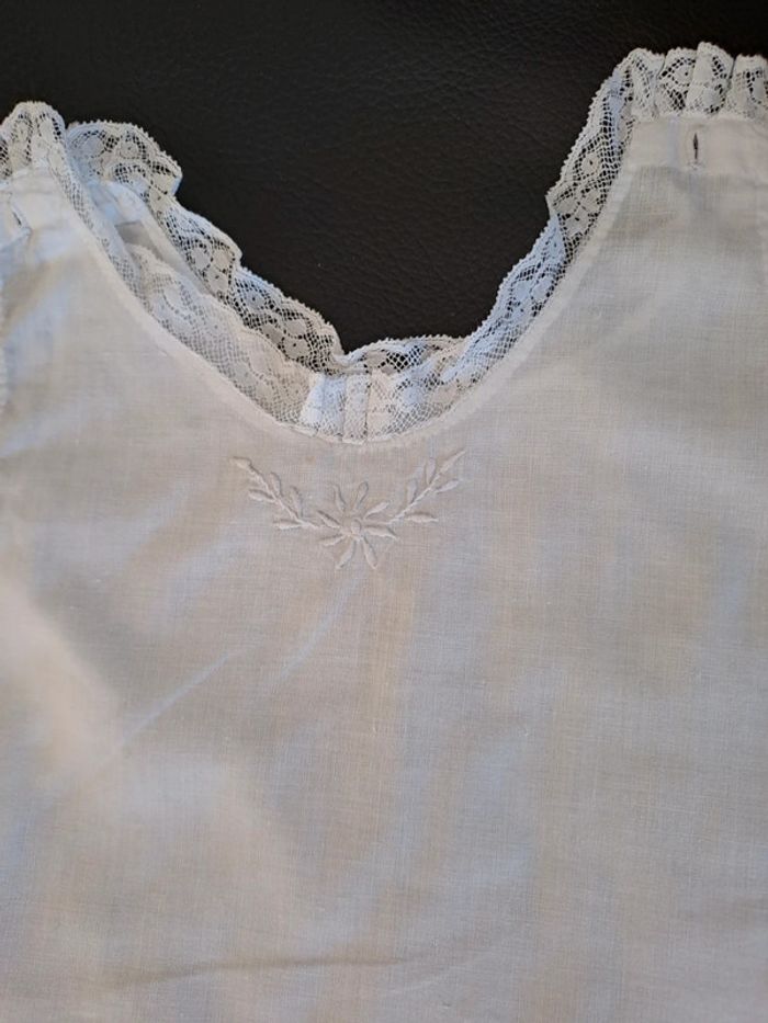 Véritables petites blouses de 1963 en coton, avec broderie et fine dentelle, boutonnage aux bretelles, une micro tâche très peu visible sur une des 2 (photo 4) Des pépites ! Largeur aisselle à aisselle 28 cm