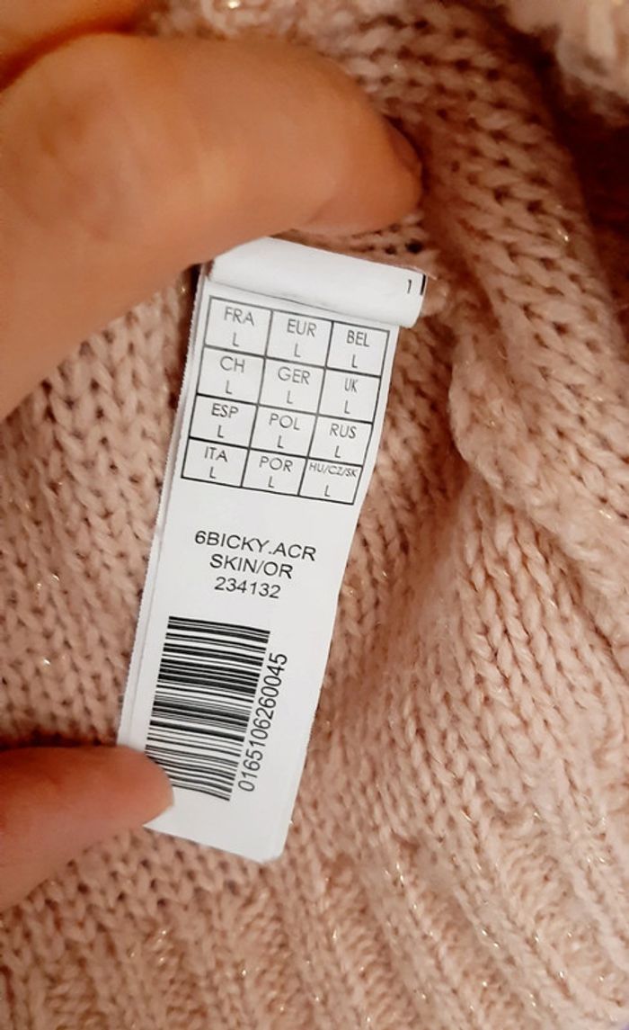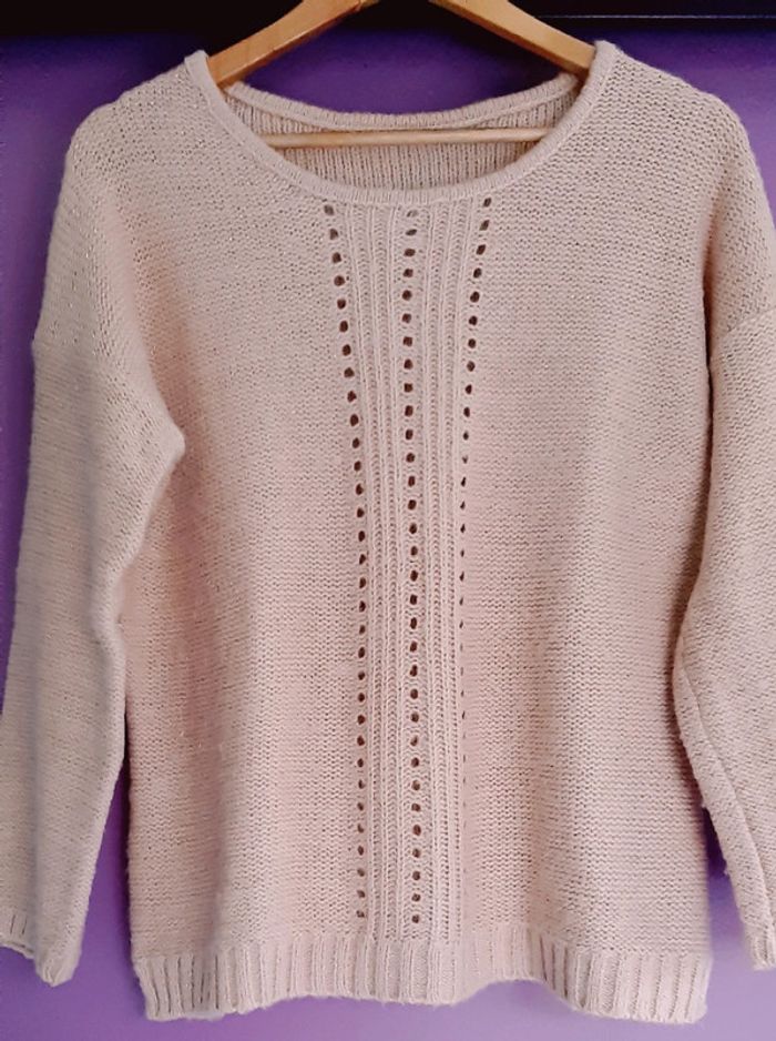 Pull rose poudré, mailles ajourées devant, discrets fils dorés, petite fente sur les côtés. Ne gratte pas