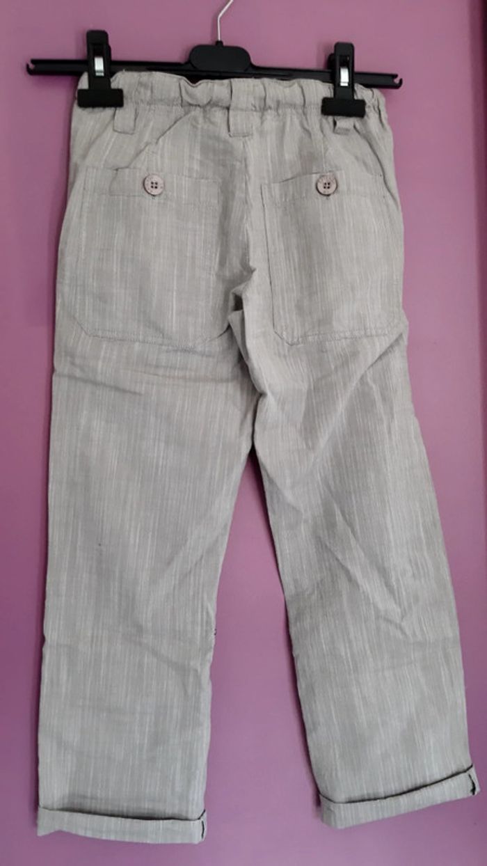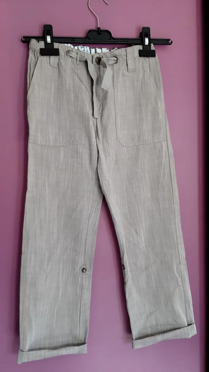 Pantalon en coton couleur gris chiné, pouvant être replié en pantacourt, poches sur les côtés, poches arrières, en excellent état, porté une seule fois ! Taille élastiquée ajustable + lien de Idéal pour cérémonie