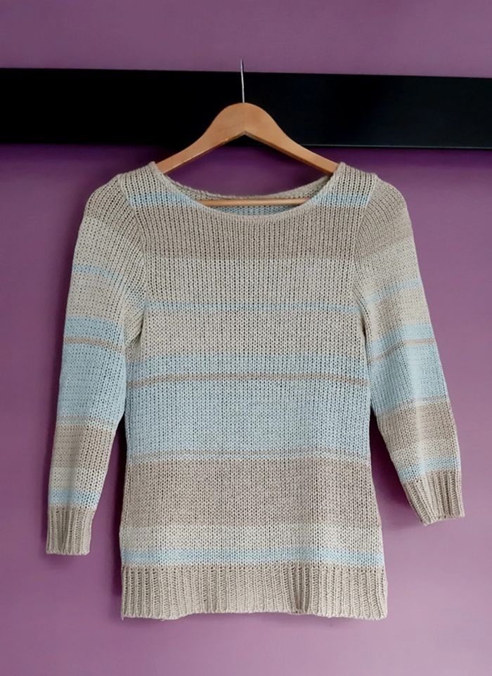 Véritable pull vintage en excellent état. Manches 3/4, coloris pastels bleu ciel et dégradé de beiges
