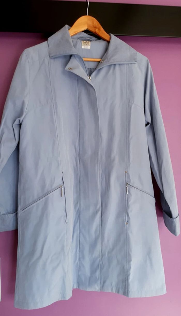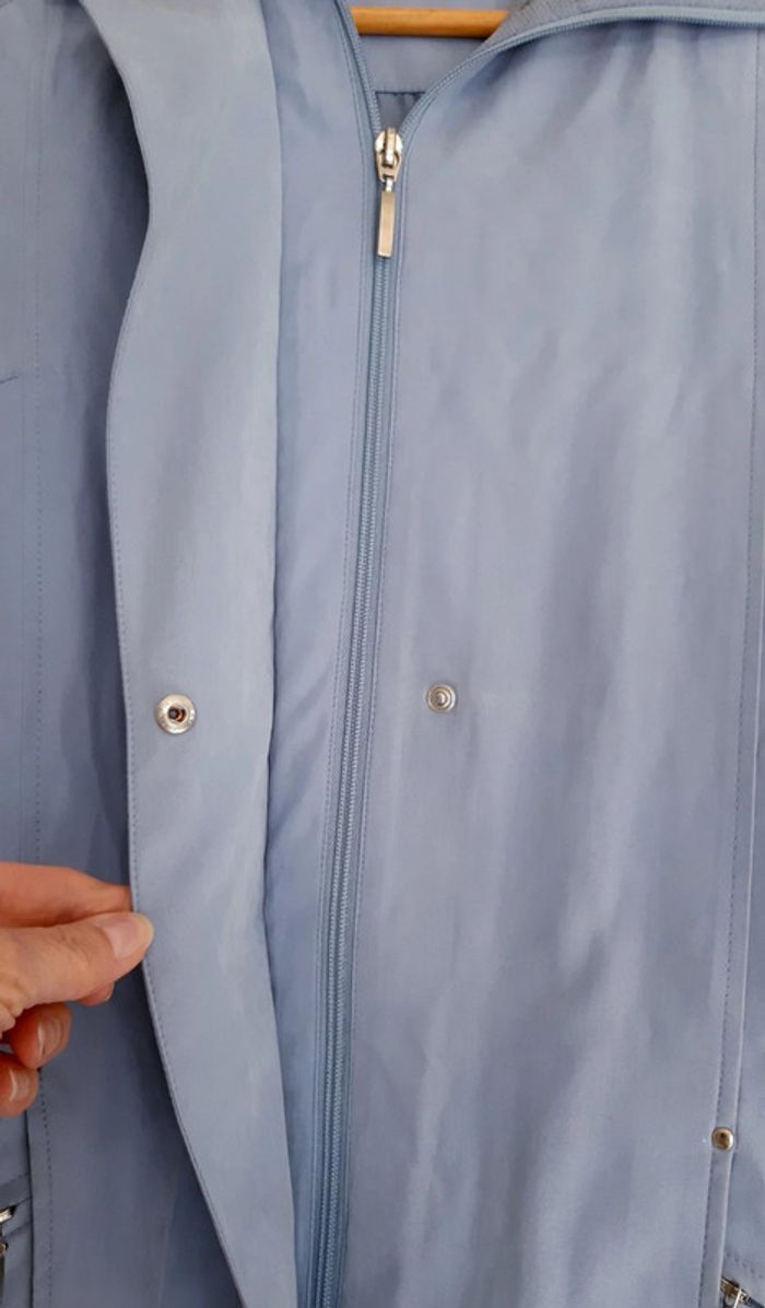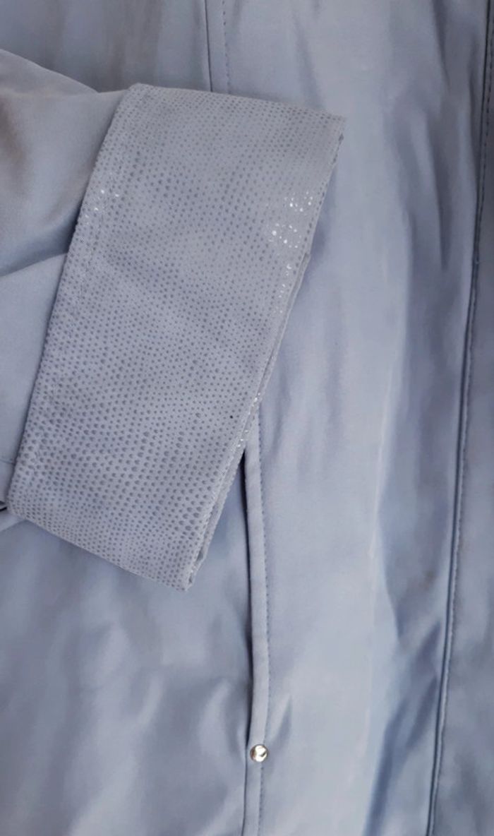 Imperméable jamais porté, double fermeture par zip et boutons pression , 2 poches zippées devant , couleur bleu/gris, longueur genou, détails brillants aux poignets et au col Indiqué taille 36/38 mais correspond à une taille 40 !