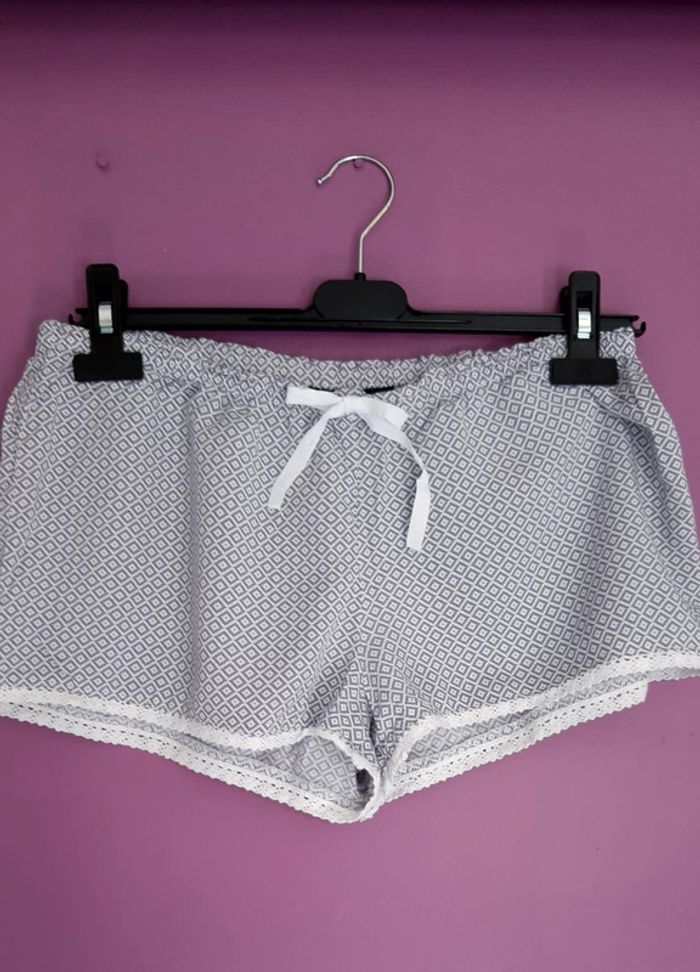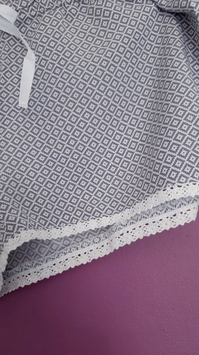 Short de nuit neuf, motifs losanges gris sur fond blanc, taille élastiquée, petit noeud décoratif