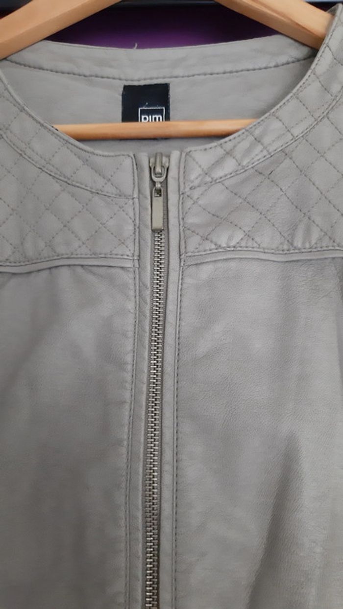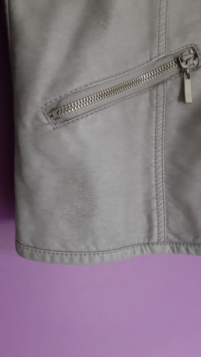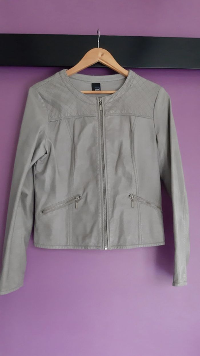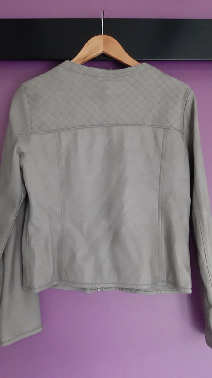 Veste simili cuir, en très bon état, couleur gris clair, 2 poches zippées devant, pas de trou ni d'accroc, présente des parties plus foncées par endroit dues à la matière de la veste, ce ne sont pas des taches ! (Photo 4) Convient également à une taille 40