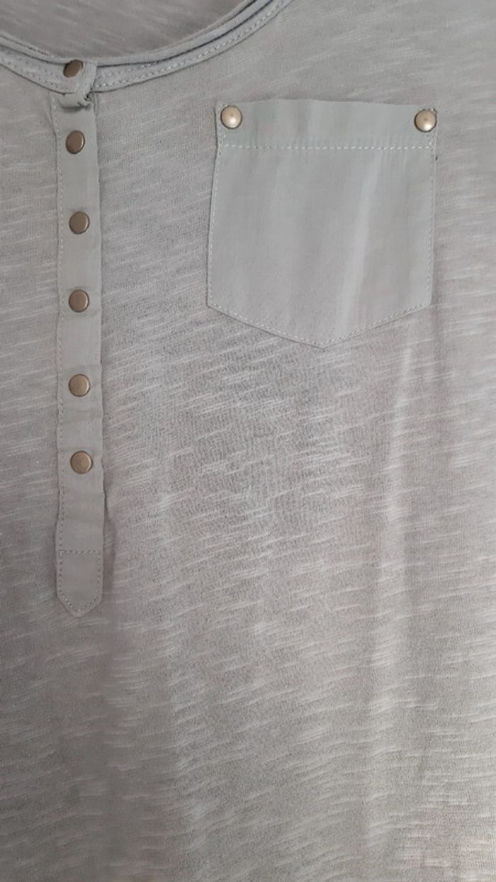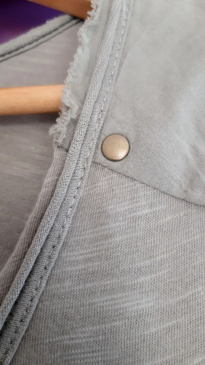 Tee-shirt jamais porté, boutons pression devant, petite poche poitrine, effet légèrement effiloché à l'encolure