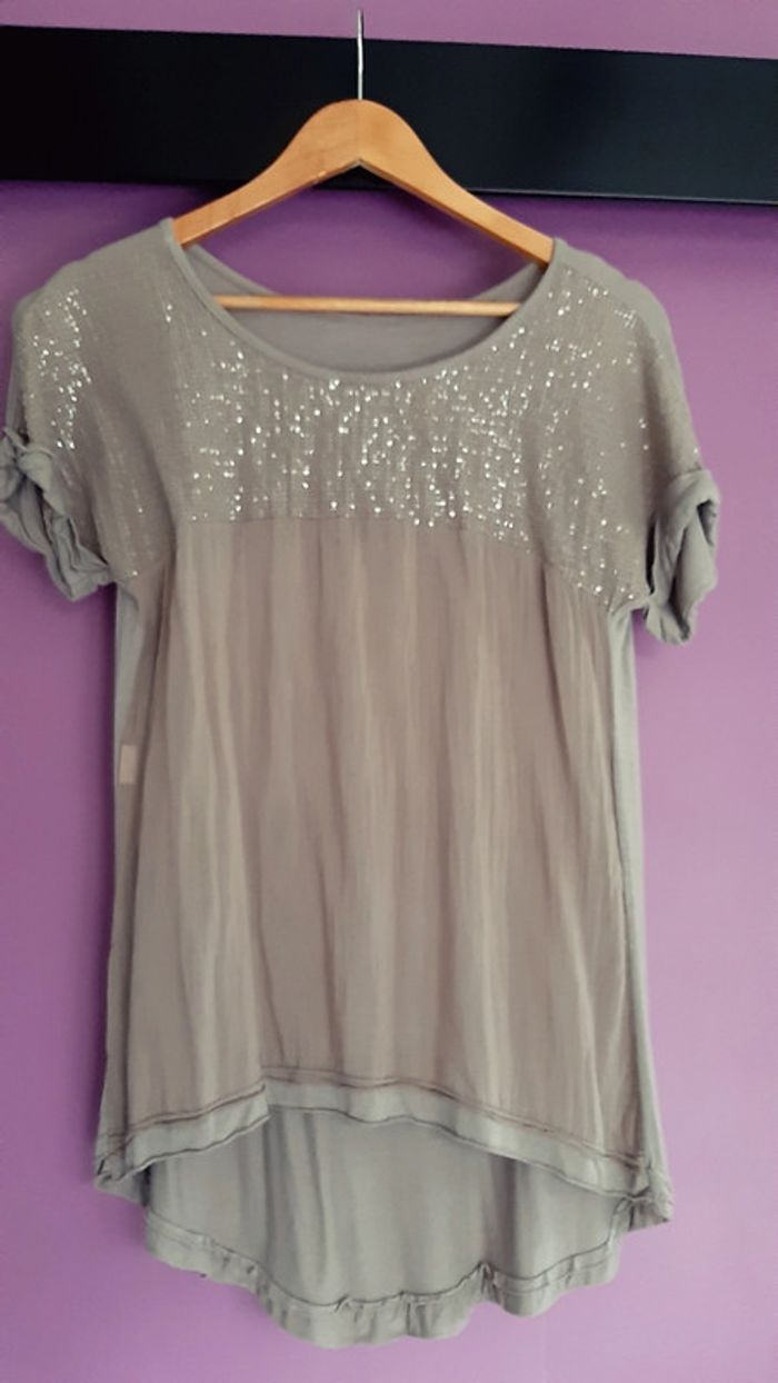 Véritable t-shirt vintage en très bon état, sequins à l'encolure, plus long derrière, bi-matière ( voile devant, coton au dos)