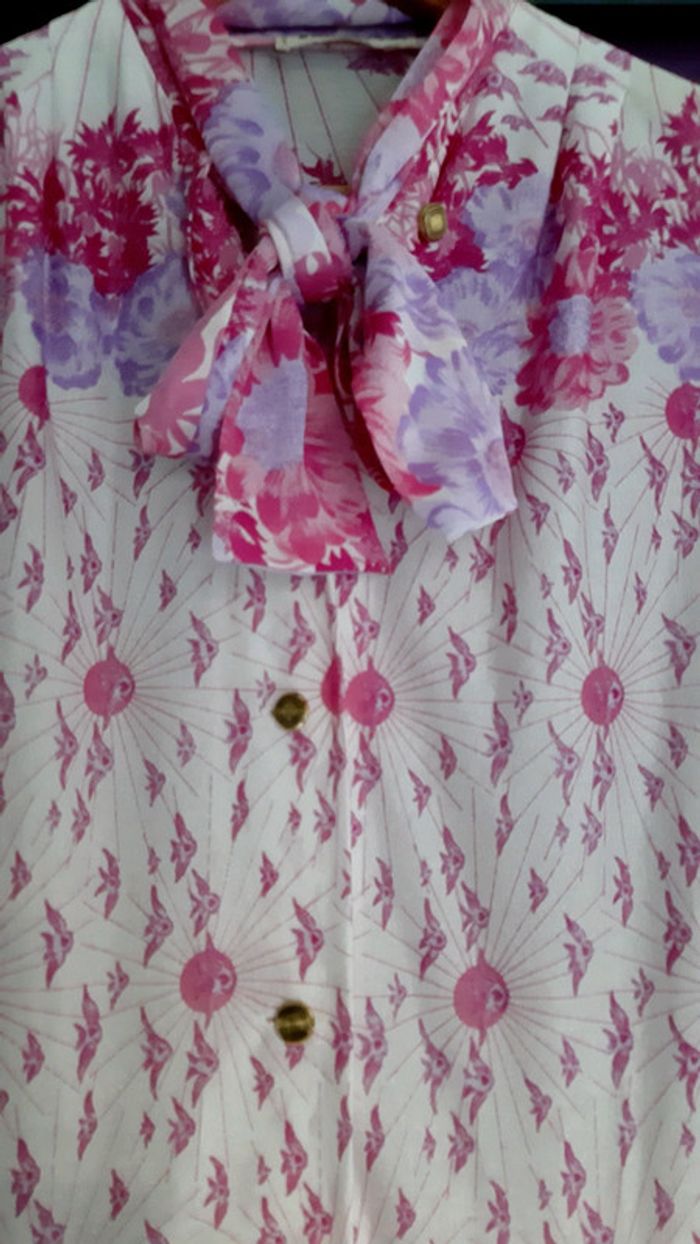 Véritable robe vintage des années 70, jamais portée, tissu fluide et léger, avec boutonnage et col à nouer, manches 3/4