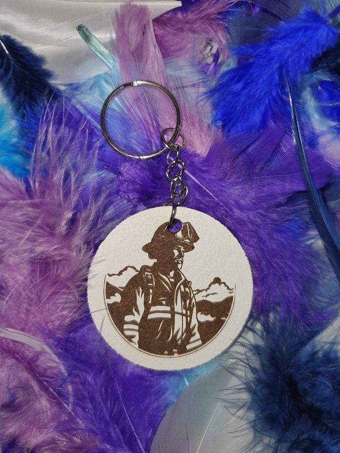 Porte clé pompier Pein en blanc sur du mdf 5 cm de diamètre Réaliser au laser Privilégier shop2shop