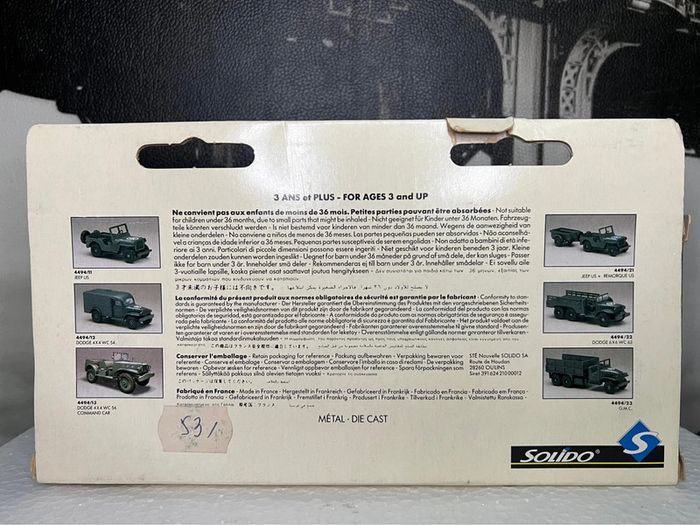 Bonjour, Je vends ma collection de miniatures. Marque : Jeep Modèle : US Fabricant : Solido (made in France) Échelle : 1/50 Édition limitée « 50th anniversaire de la libération » 1944-1994 Modèle dans sa boîte d’origine Envoi rapide et soigné !