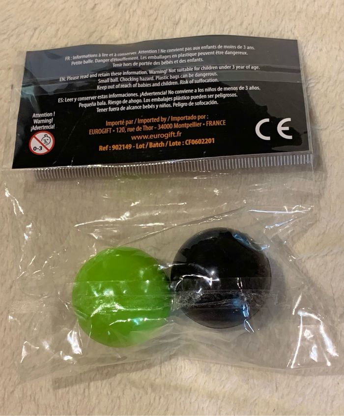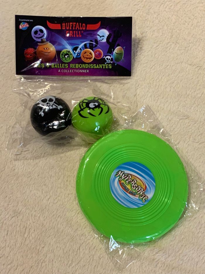 Lot 2 jeux enfants - Frisbee (disque volant) en plastique, couleur vert diamètre 10 cm - 2 balles rebondissantes vertes et noires halloween, diam. 4cm, Buffalo Grill #cc_jouetscc #jouetenfants #frisbee #balles #disquevolant