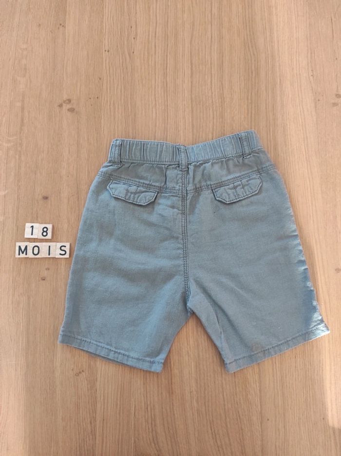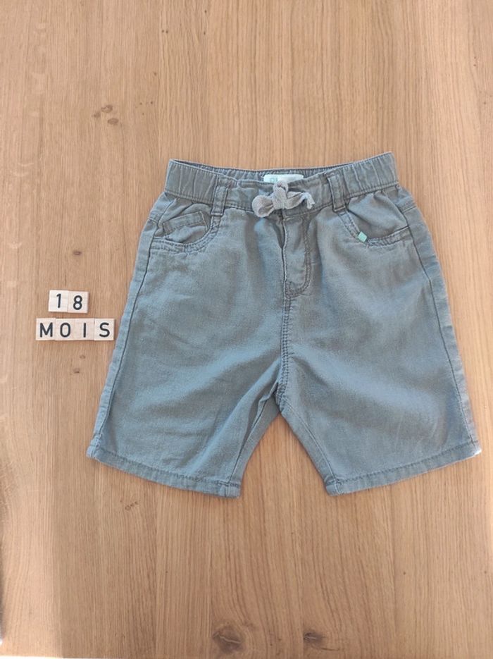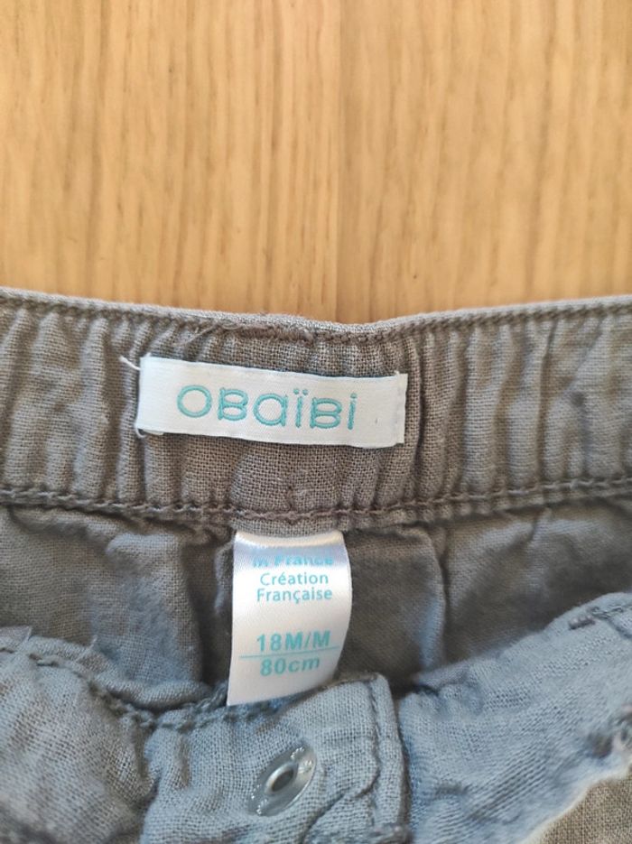 Short Obaïbi, tissu type lin, souple, en très bon état, taille 18 mois, couleur taupe. Tee-shirt assorti en 23 mois également disponible dans mon dressing.