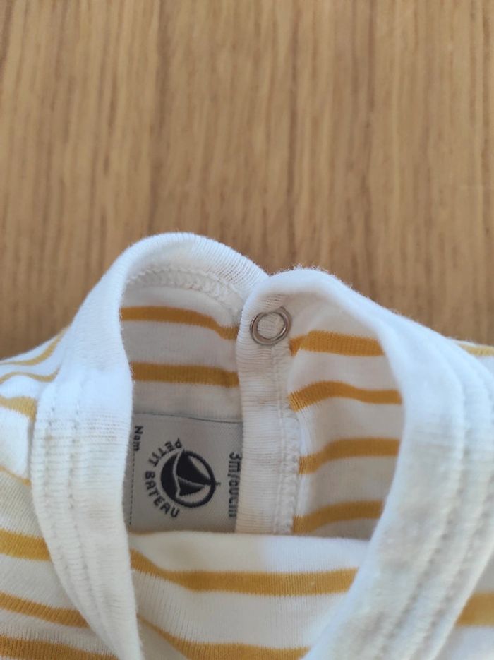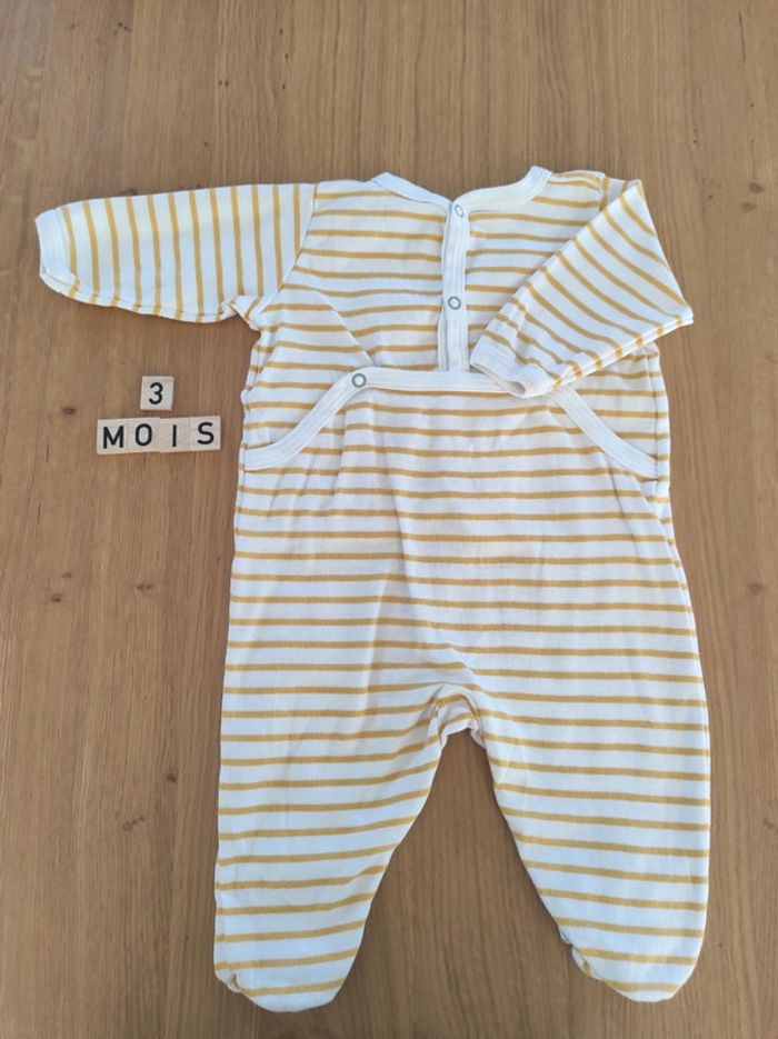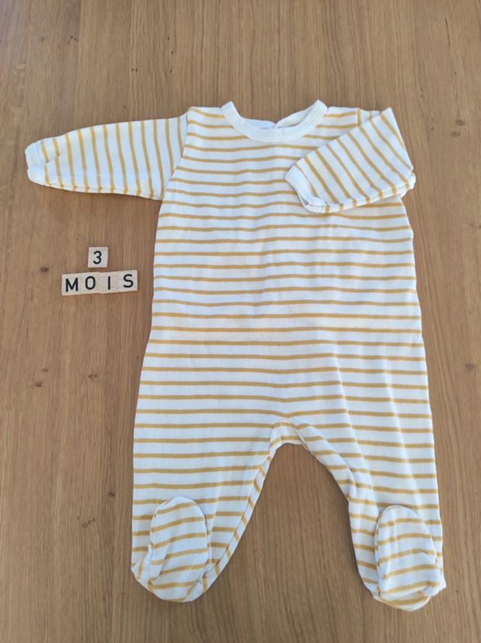 Pyjama en coton Petit Bateau, taille 3 mois en parfait état. Rayé jaune et blanc, fermeture dans le dos.