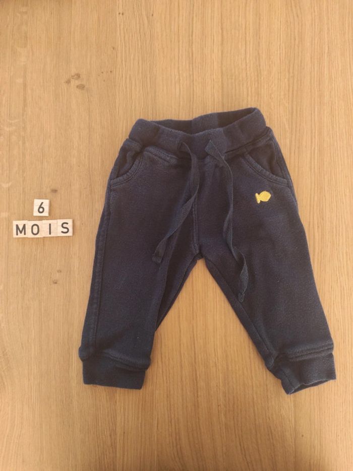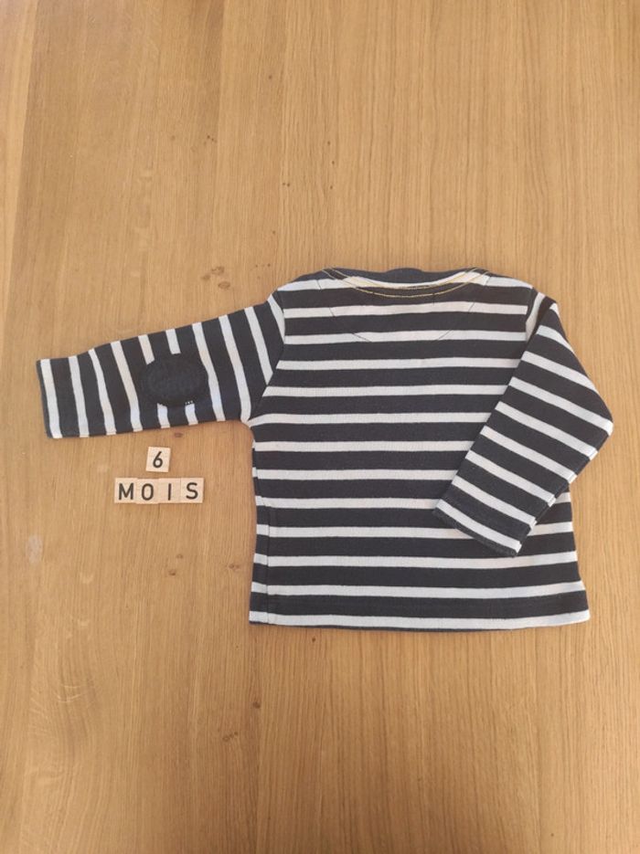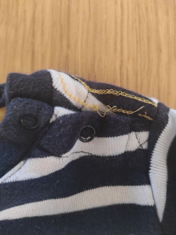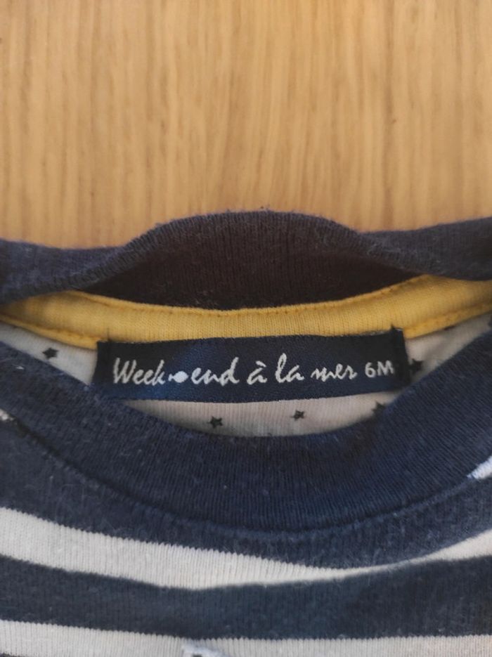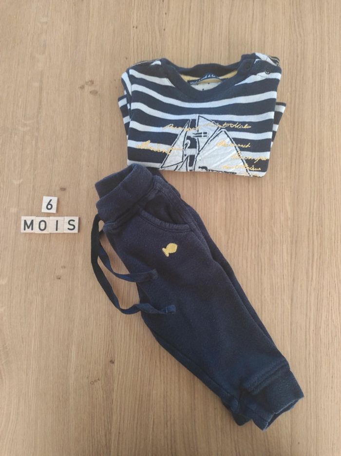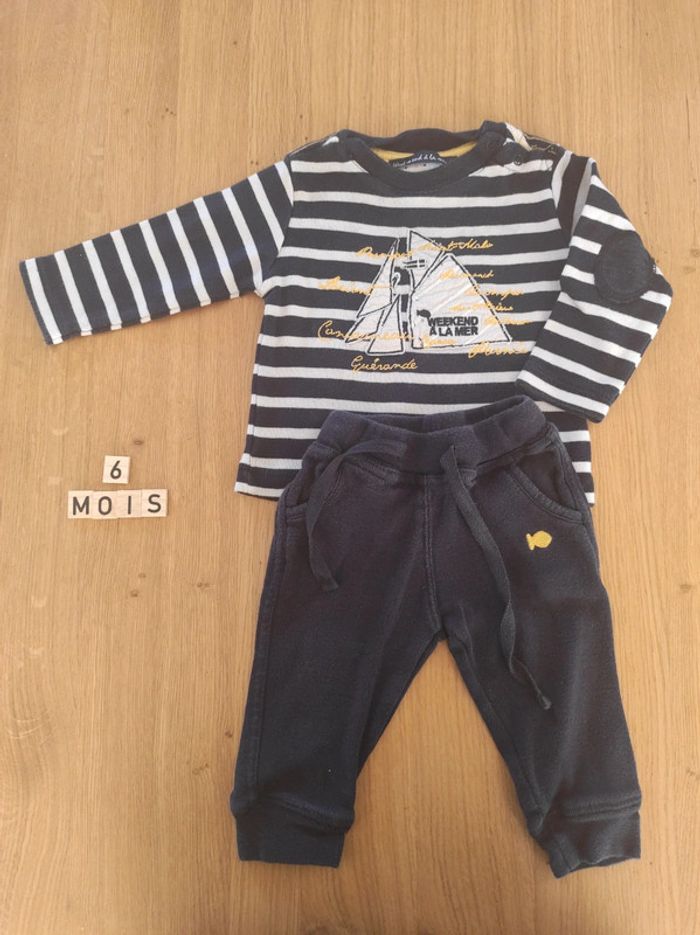 Ensemble weekend à la mer, taille 6 mois, composé de : - un pantalon souple type jogging - un haut manches longues marinière. En bon état car a été bien porté, et un petit défaut sur une couture au niveau de l'épaule.