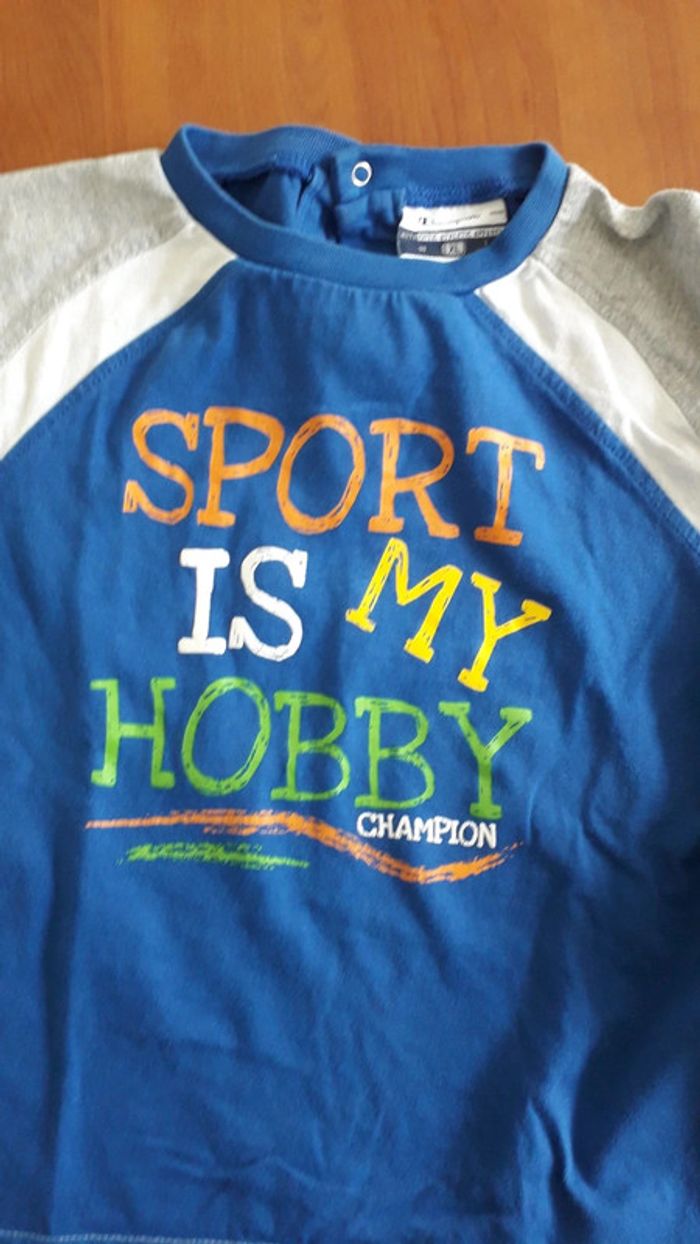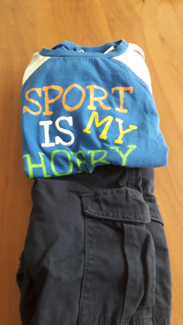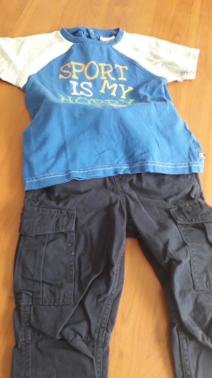1 tee-shirt Champion bleu en parfait état 1 pantalon bleu marine 2/3 ans lupilu en très bon état.