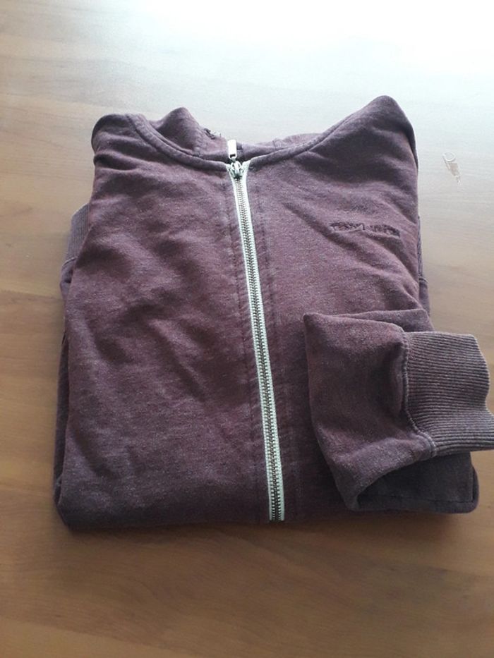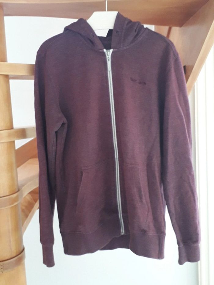 Veste sweat zippée avec capuche de couleur aubergine/ prune. Manque le lien de la capuche.