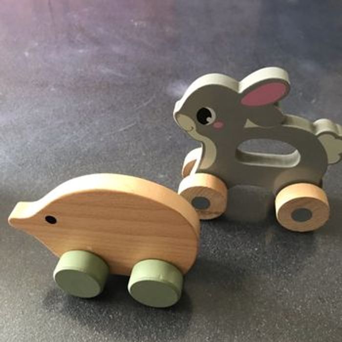 Lot de 2 jouets bébé en bois. Petite taupe et petit lapin. Dimensions : taupe, 13cm/9cm. Lapin, 13cm/12,5cm. Très bon état, très peu utilisés.