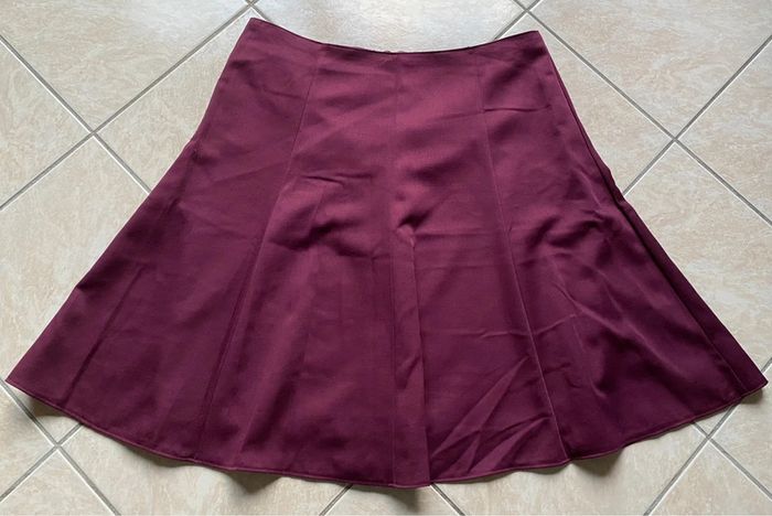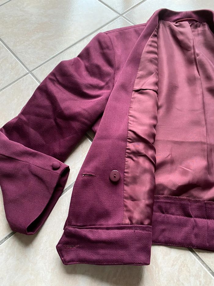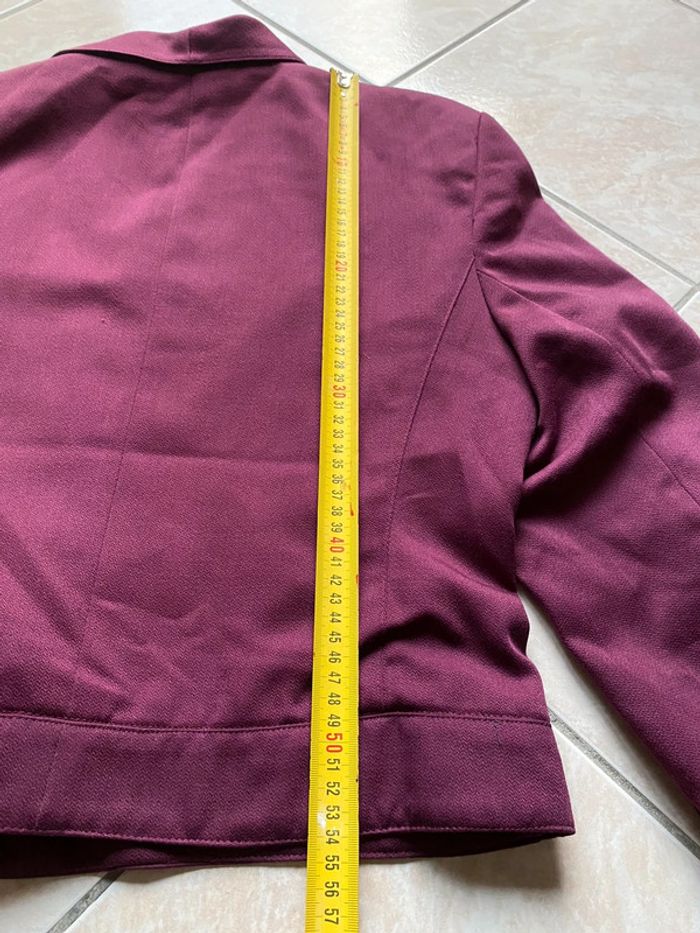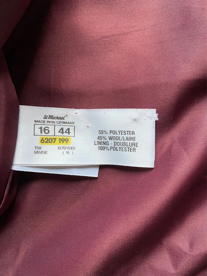 Très bel ensemble jupe + blazer Marks and Spencer, couleur prune avec 45% de laine. En excellent état. Taille 42/44 - Blazer manches longues avec fermeture par boutons. Longueur 54 cm - Jupe avec doublure intérieur, fermeture par fermeture éclair. Longueur environ 61,5cm