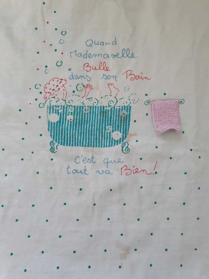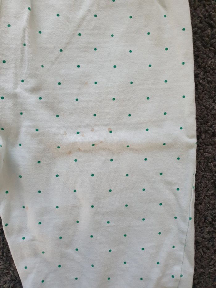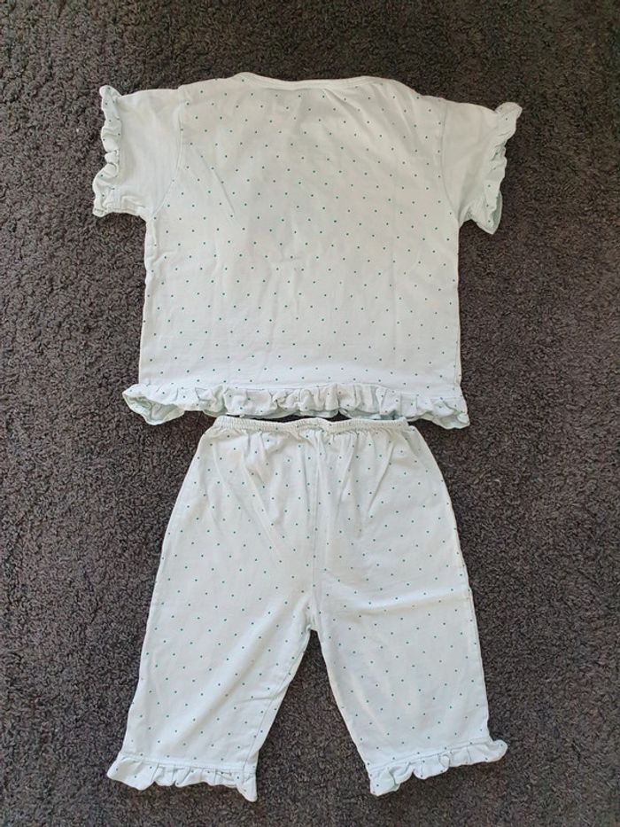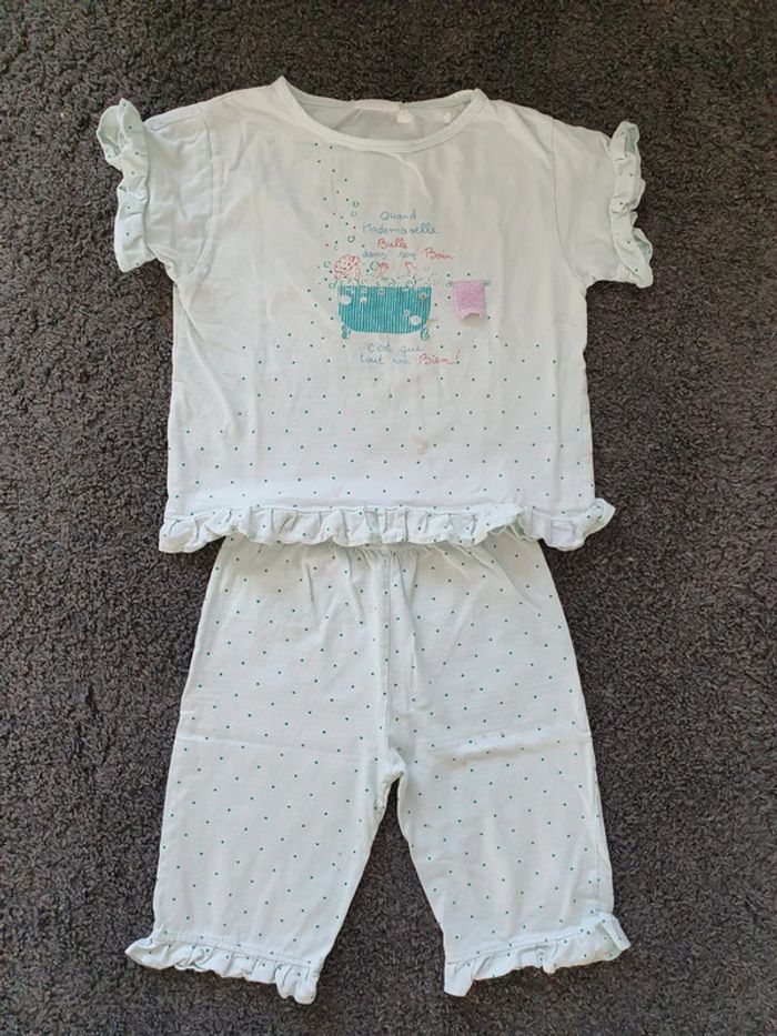 Pyjama vert d'eau léger, short et t-shirt. Il est en très bon état sauf des tâches de chocolat chaud, d'où le petit prix!